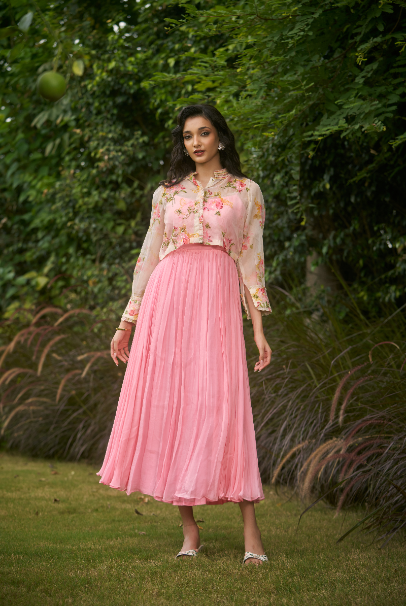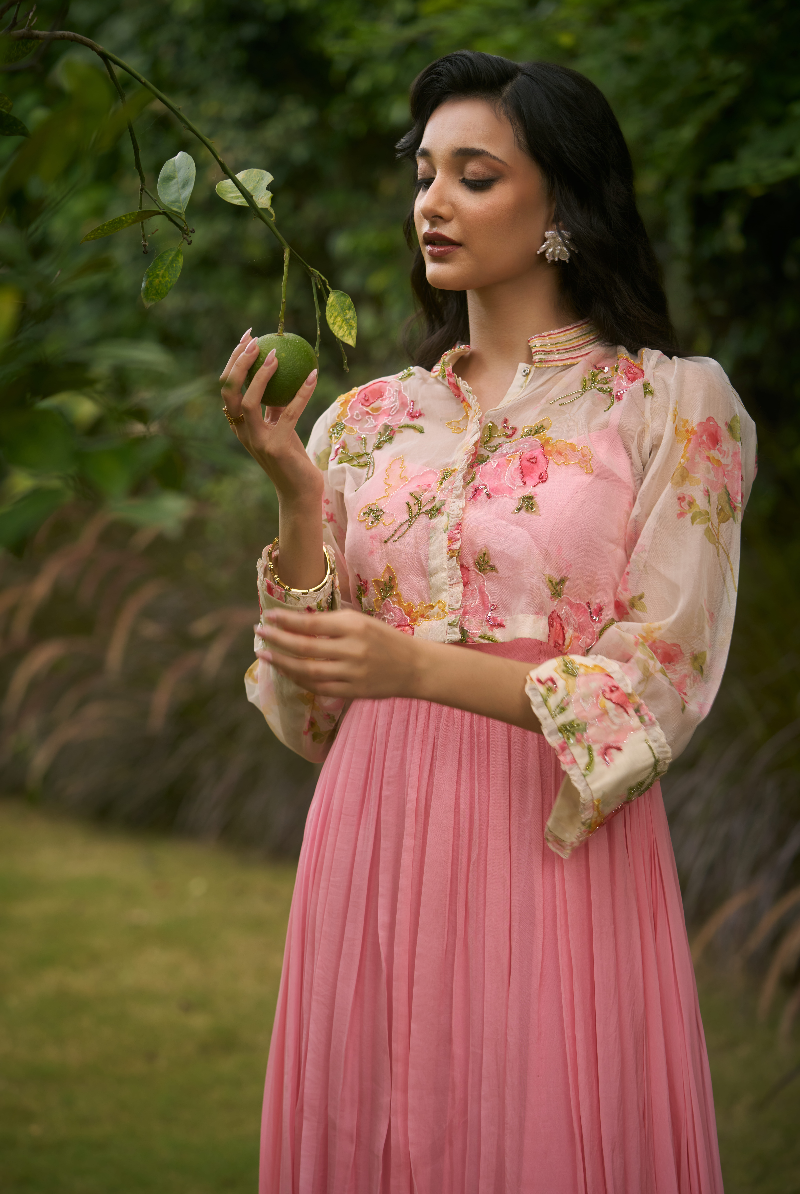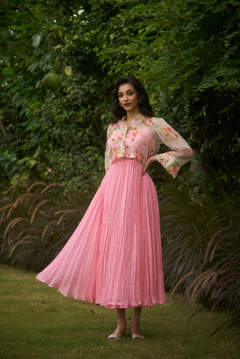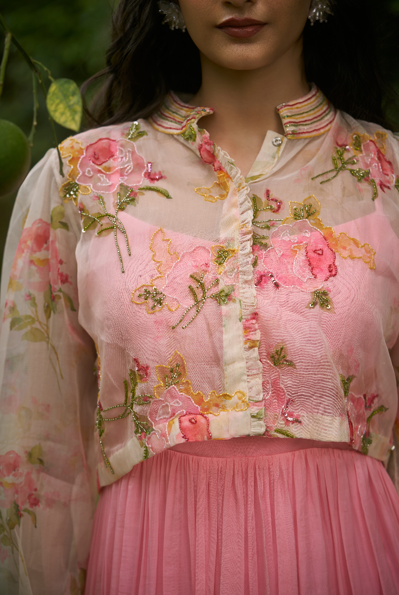 Ivory and pink hand embroidered organza short jacket with a solid dress.