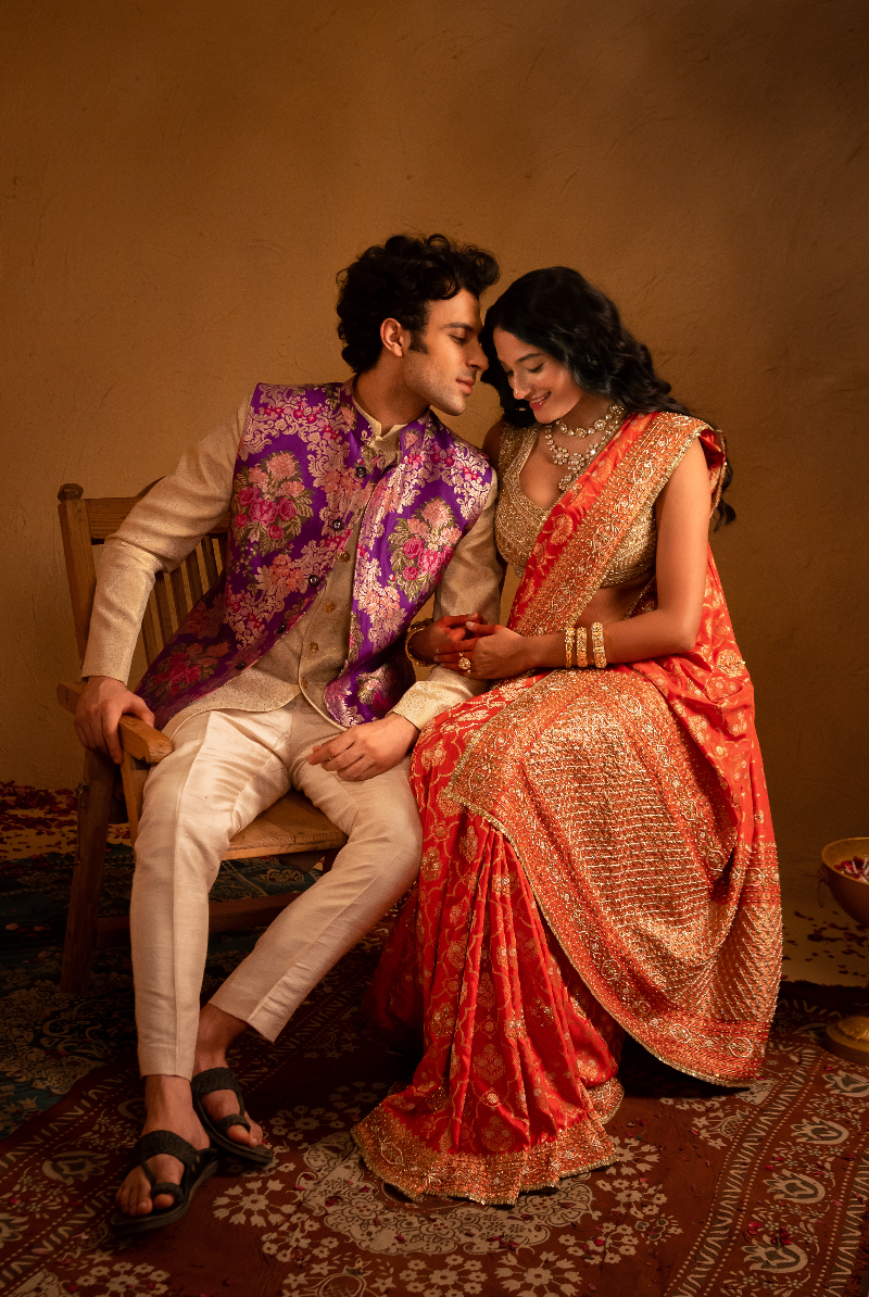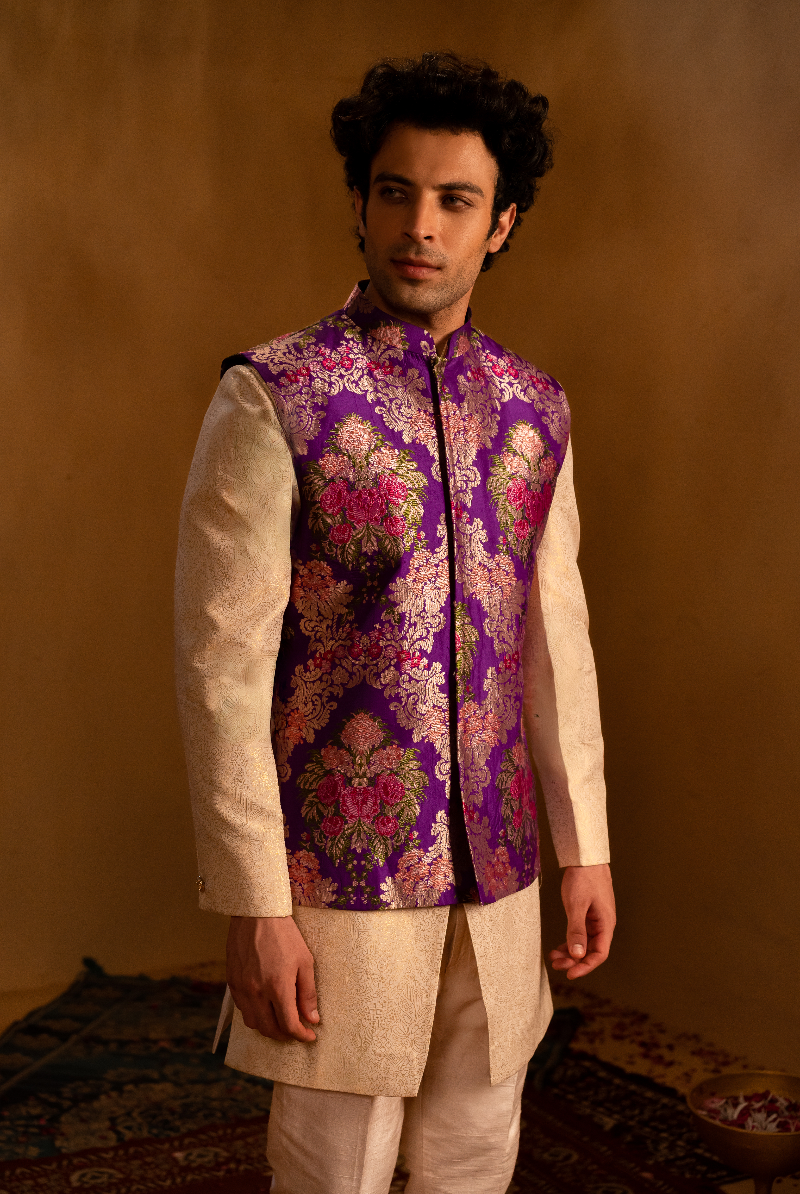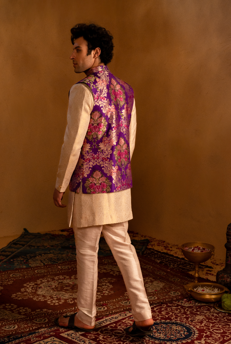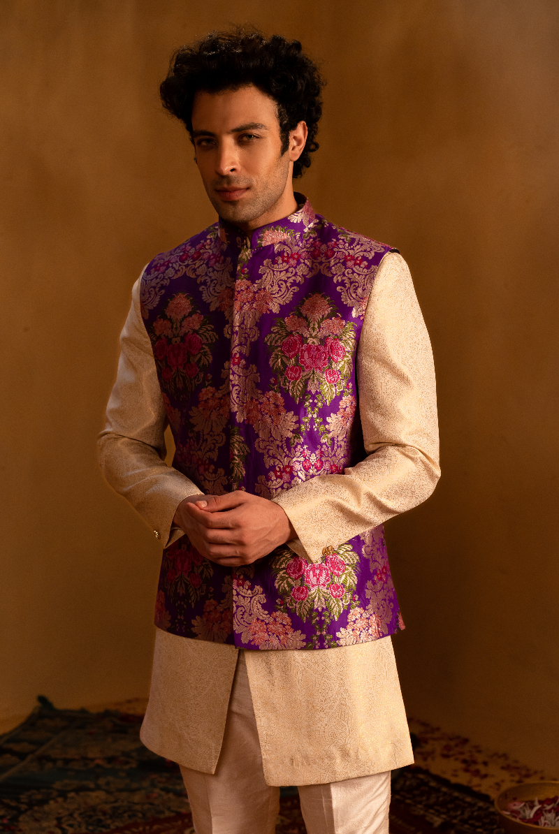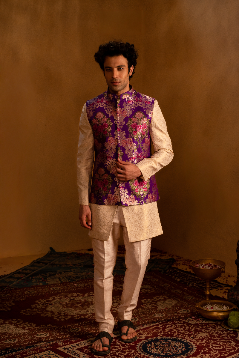Ivory Gold Sherwani With Dark Purple banarasi Koti Set.