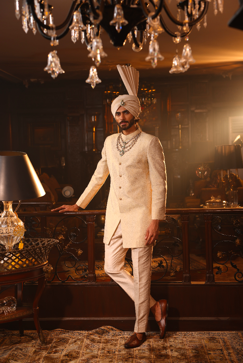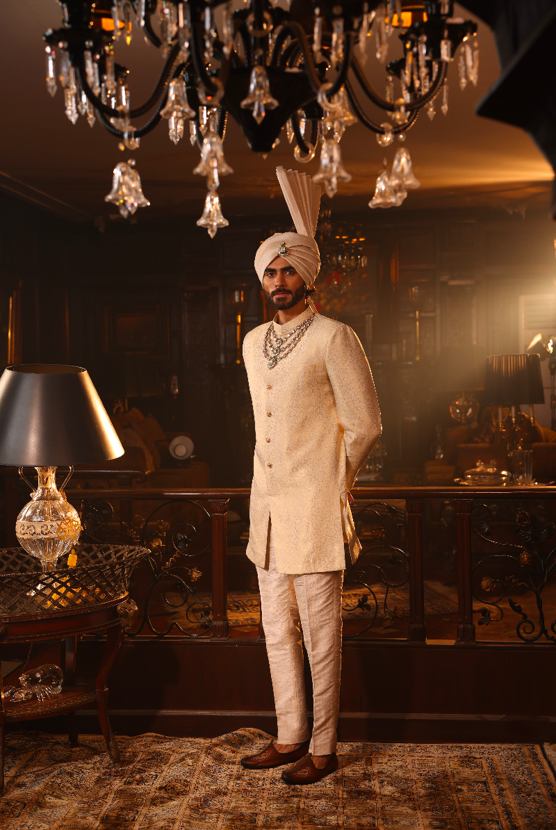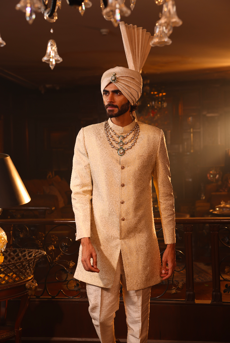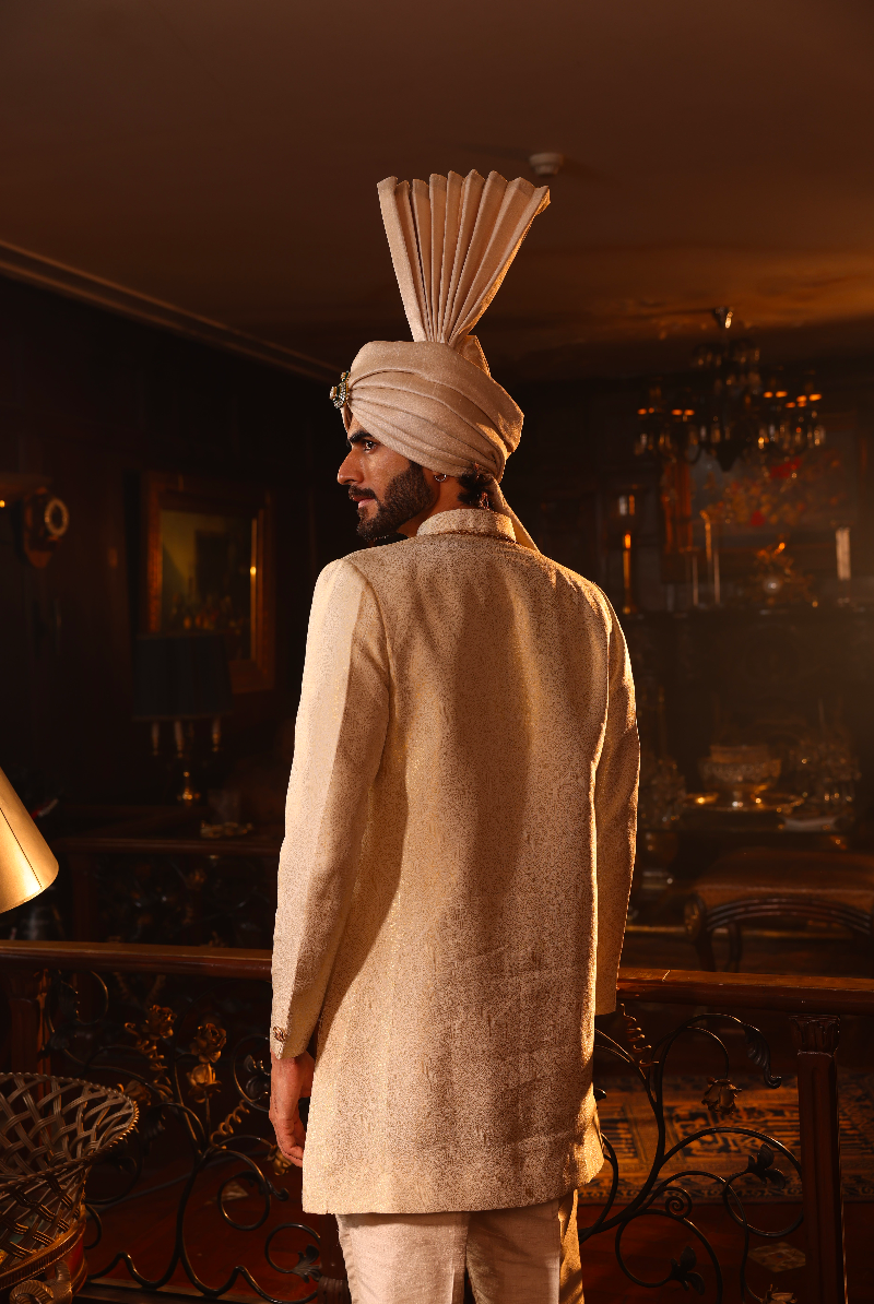 Beige Gold Sherwani in Rich Banarasi Weave.