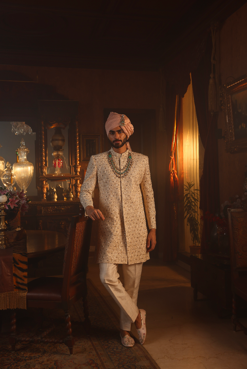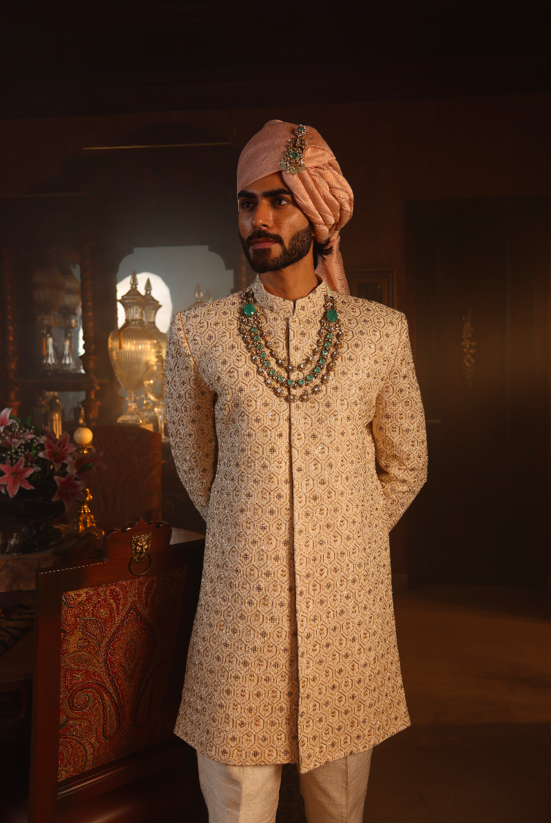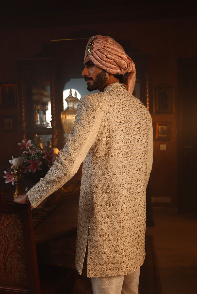 Beige Handcrafted Sherwani set in geometric motifs