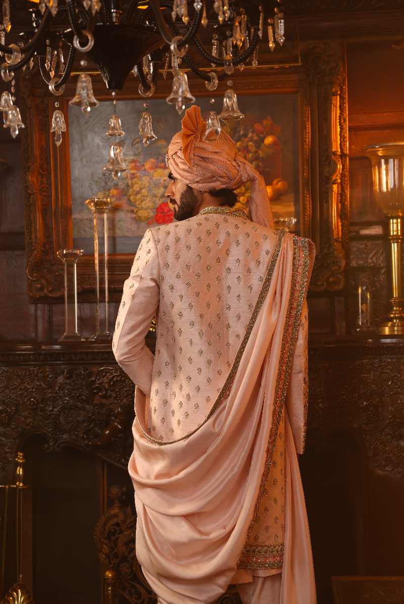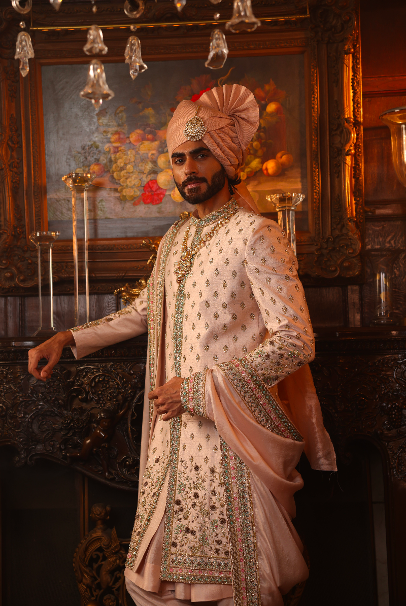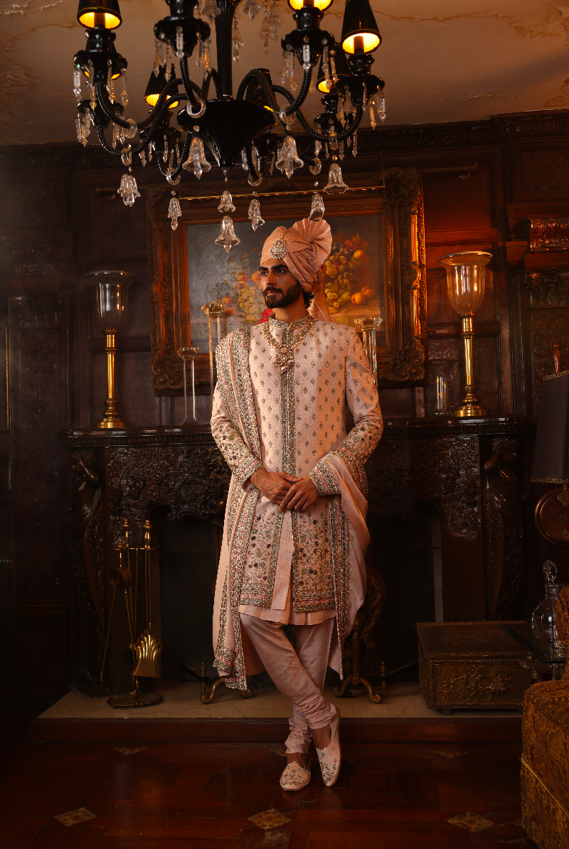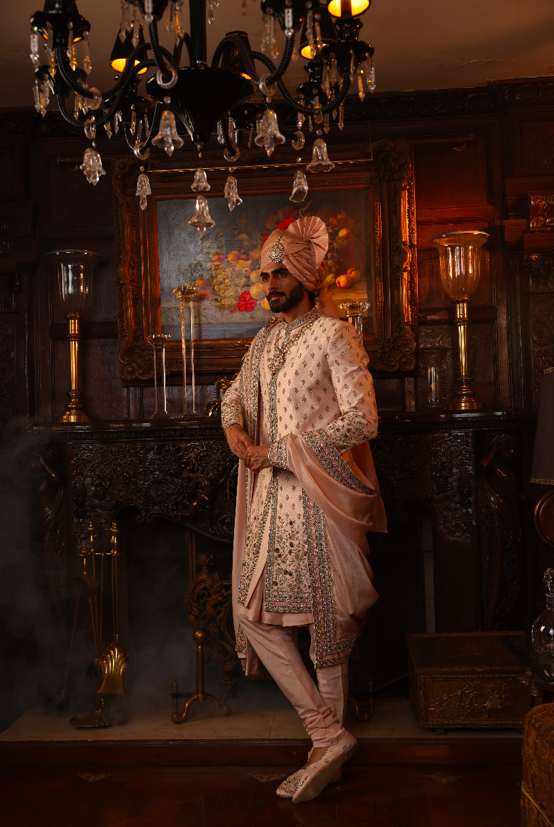 MORPANKH SHERWANI, Blush Pink Sherwani set embroidered in resham and zardosi work.
