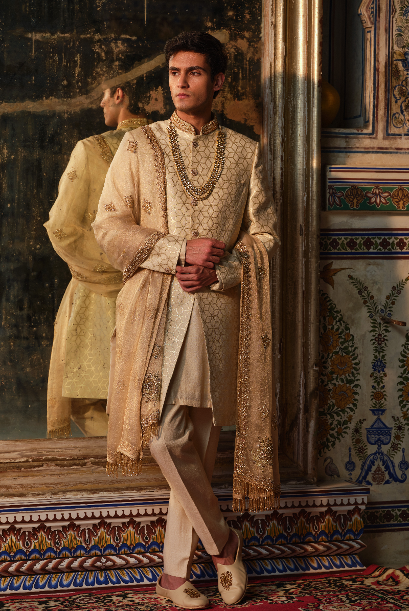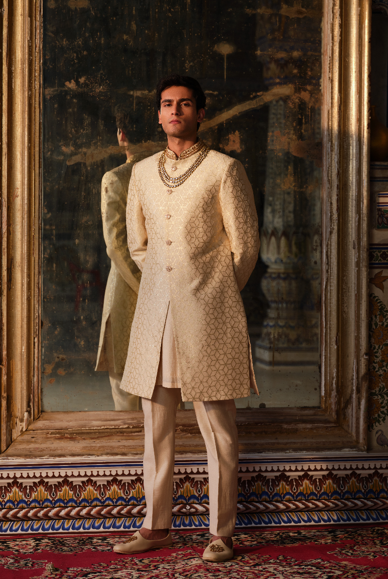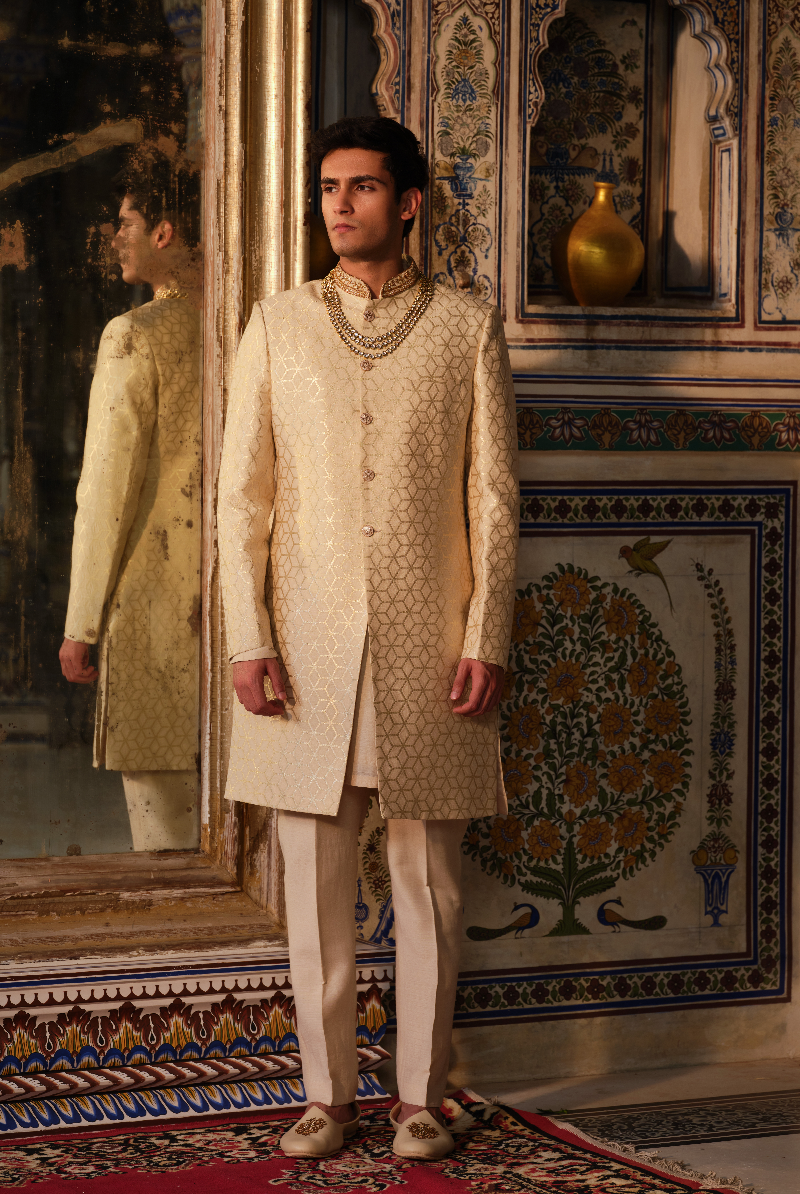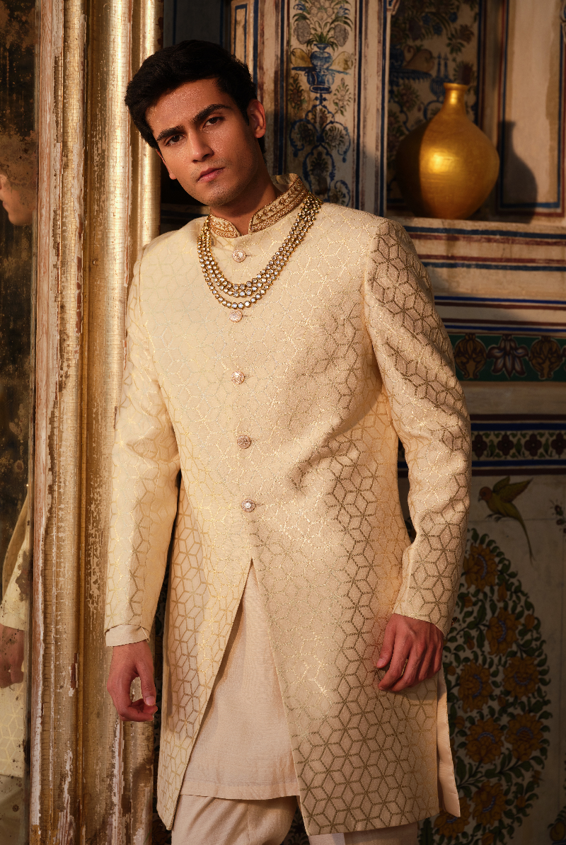 Cream Gold Munga banarasi Zari weave Sherwani set in Geometric pattern and Handcrafted Collar.