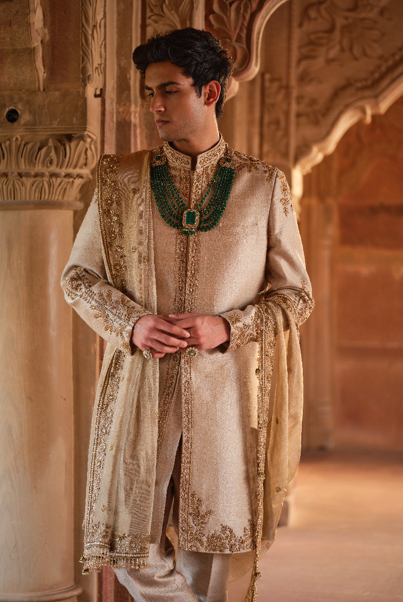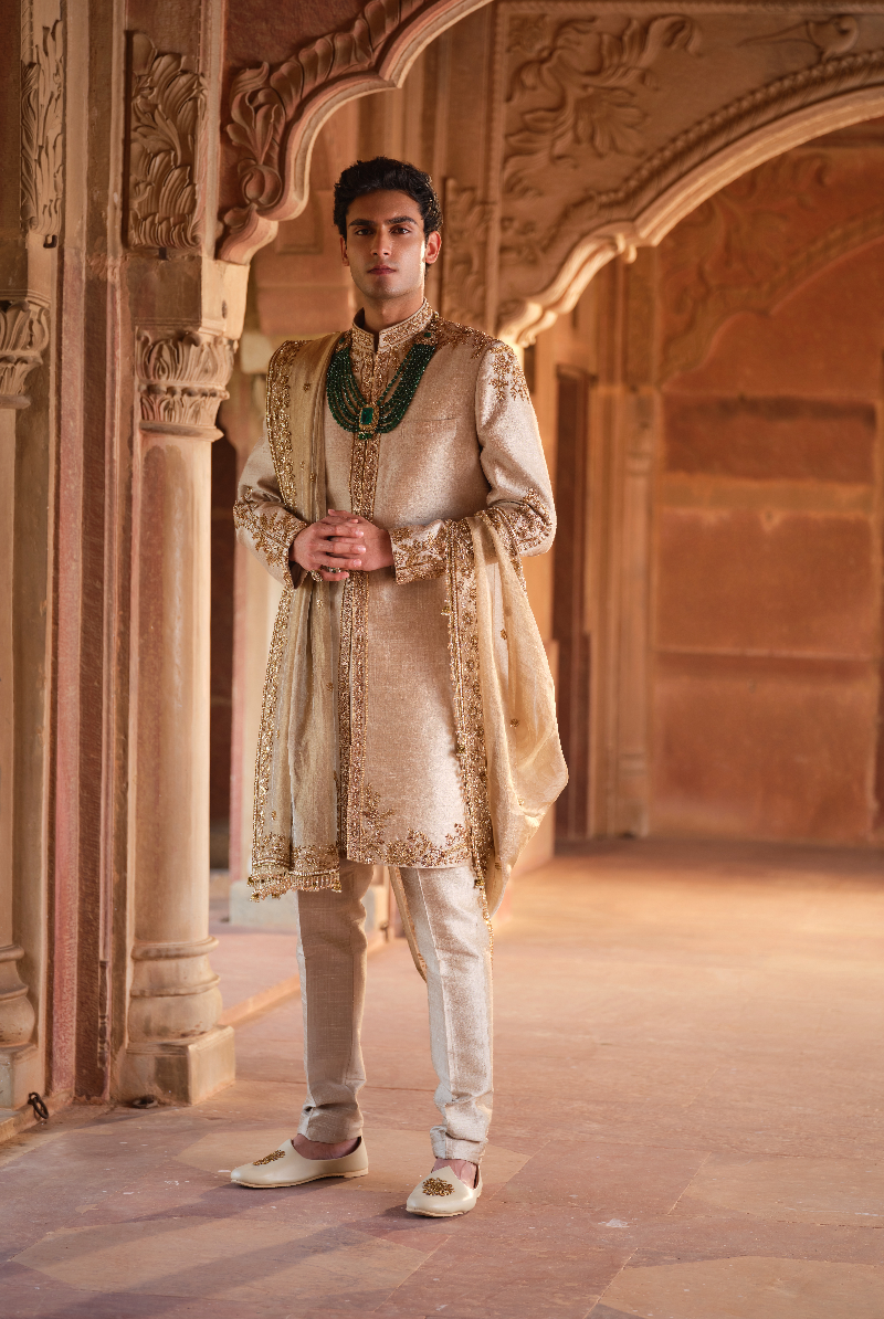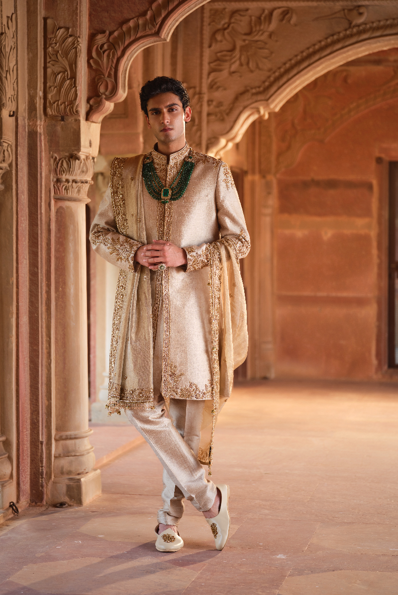 A luxurious handloom raw silk sherwani with gold embroidery in traditional motifs, paired with matching straight pants.