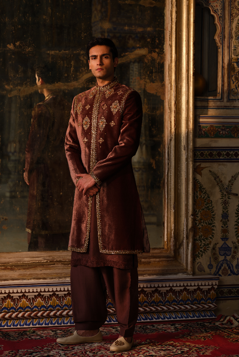 A regal brown velvet sherwani with gold embroidery, paired with a matching solid kurta and stylized pants.