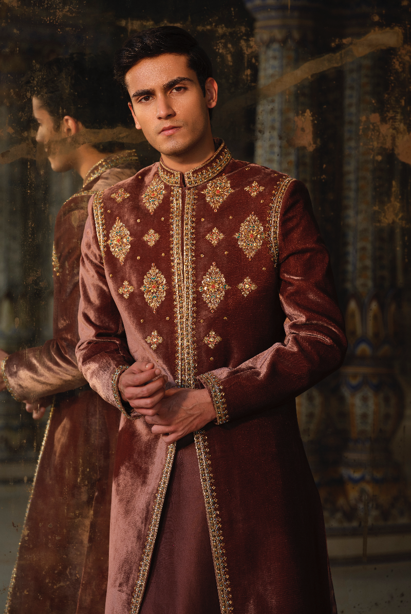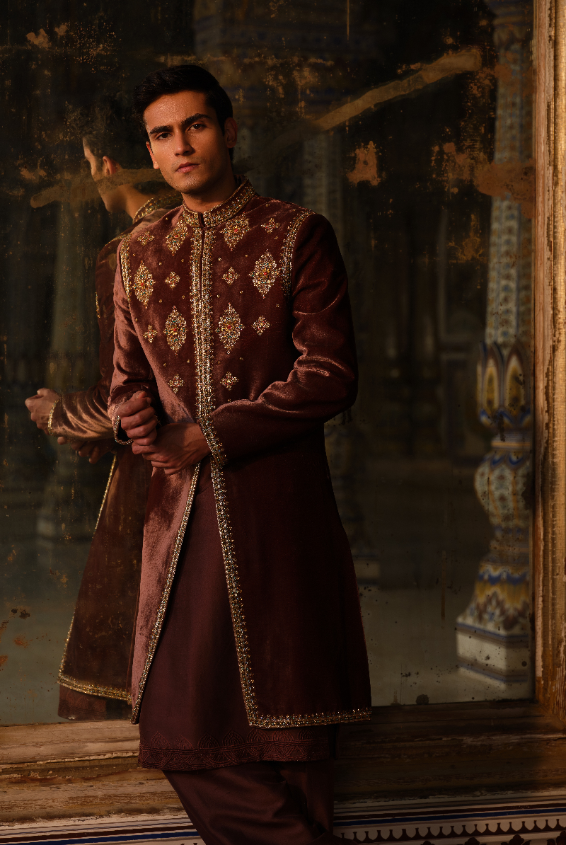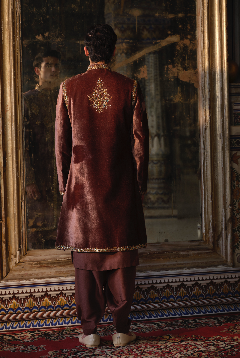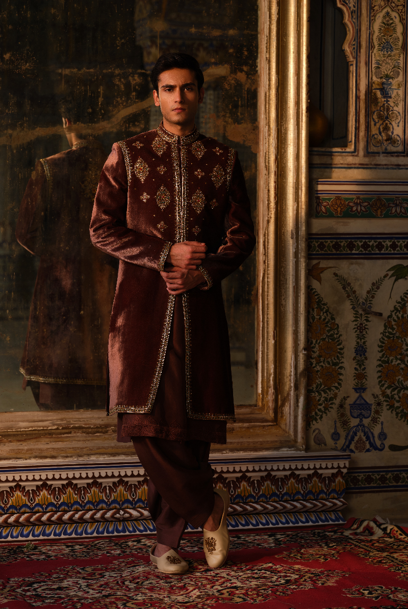 Mocha Brown Velvet hand Embellished Sherwani Set.