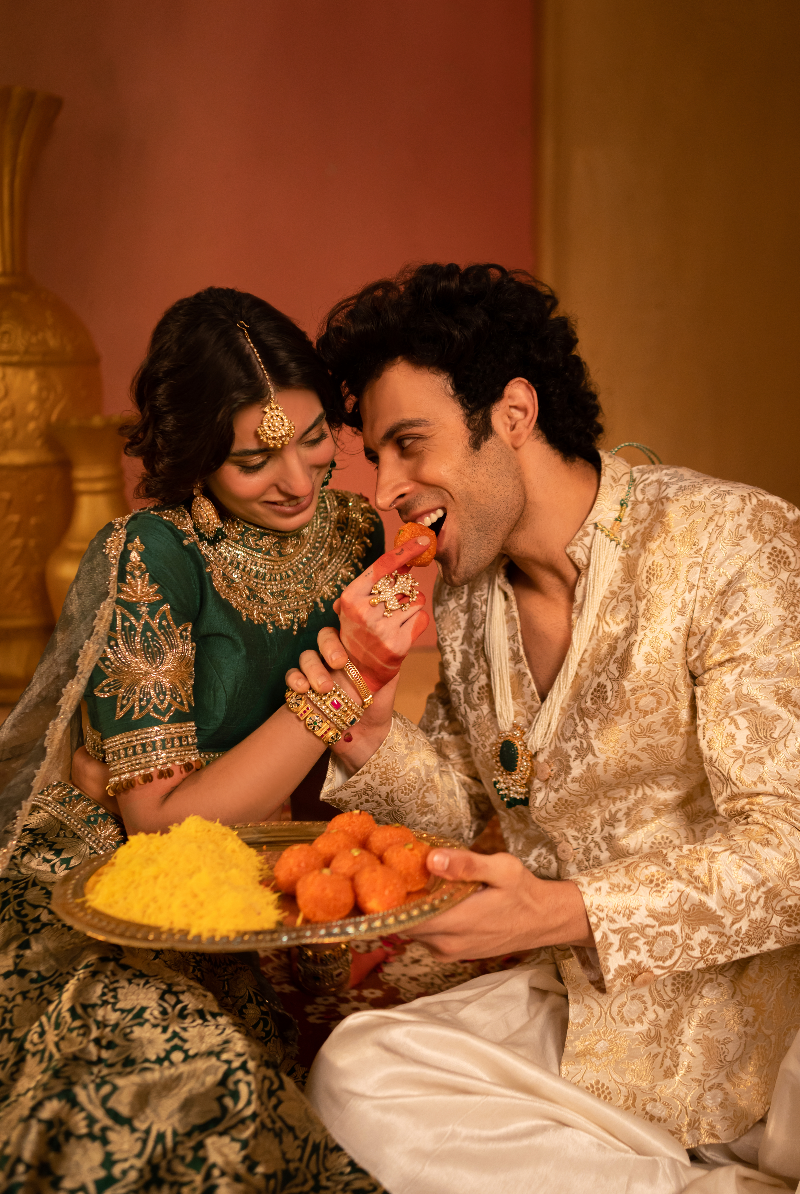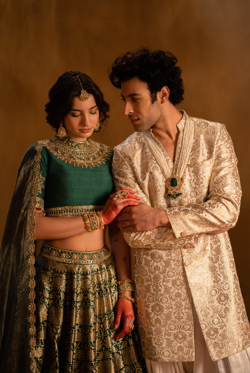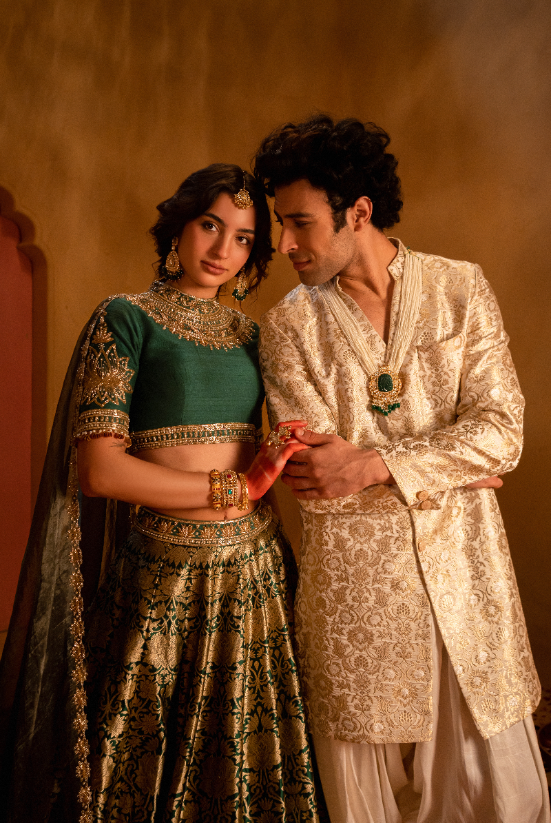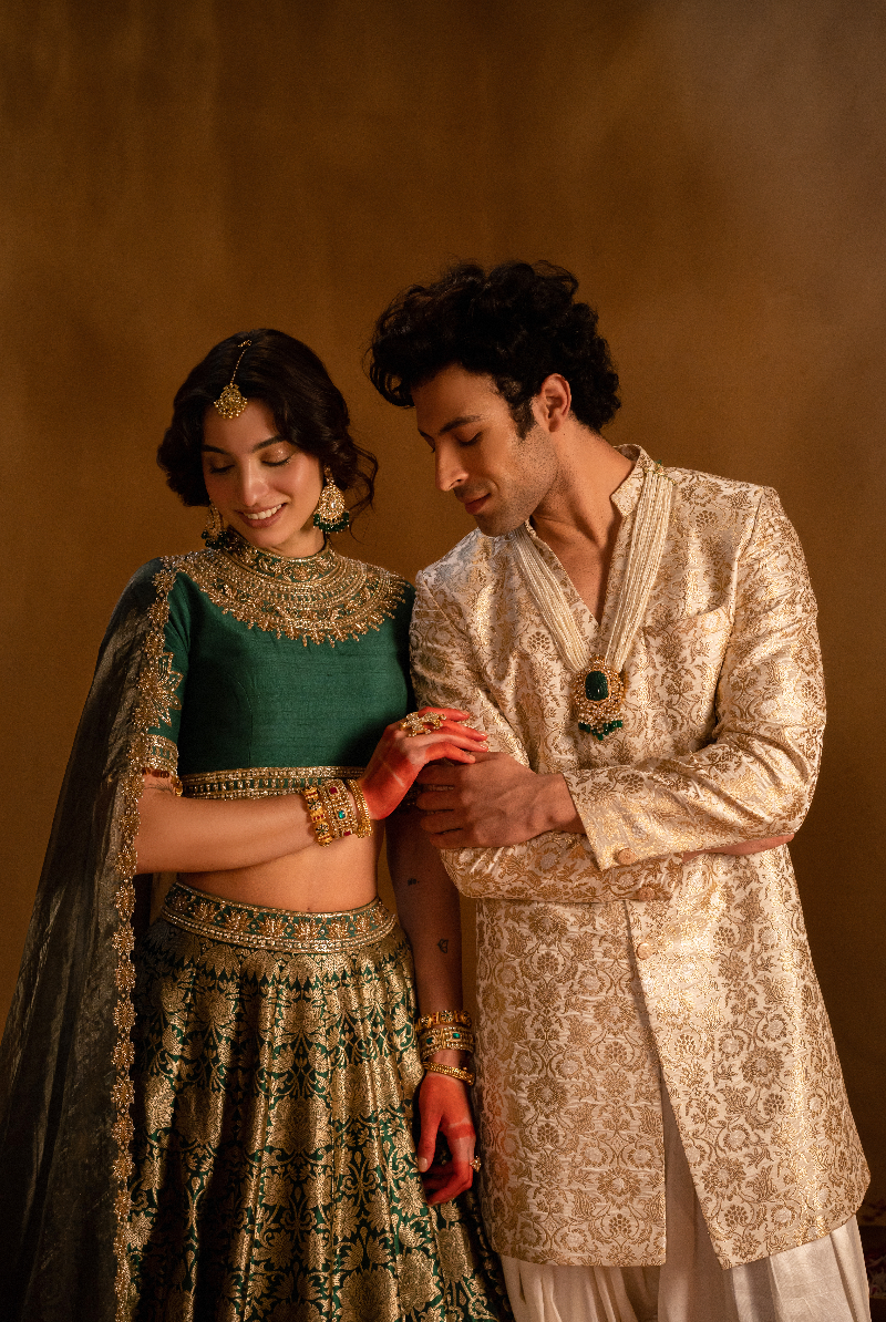 Pearl White Light Gold Kinkhab Sherwani Salwar Set