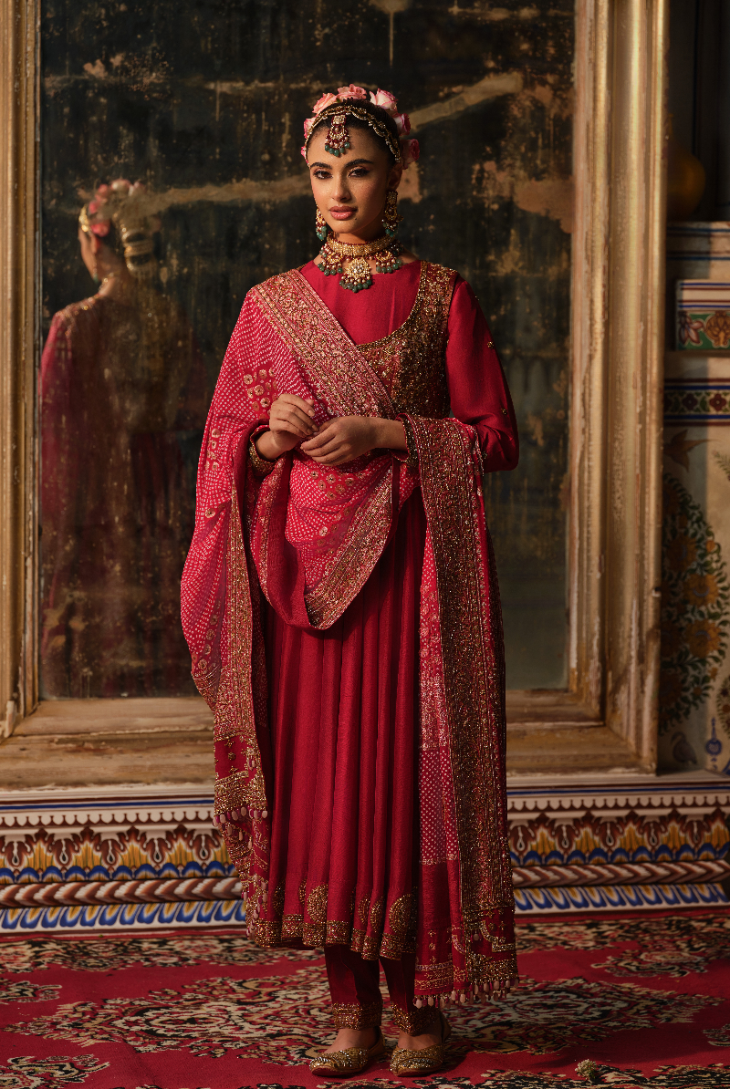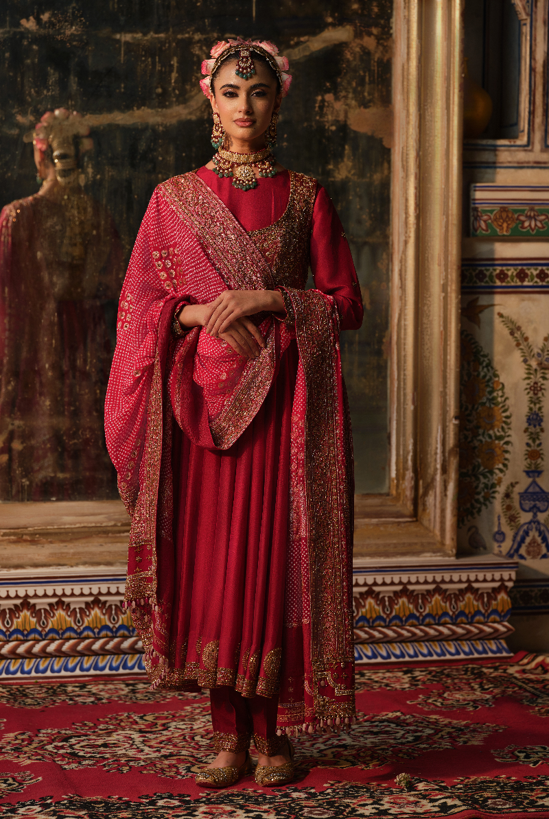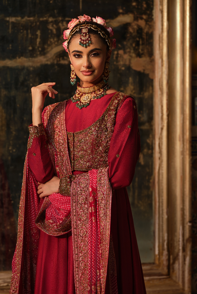 Burgundy Red Anarkali with a gold-embroidered tissue jacket, paired with border-embroidered pants and a traditional Bandhani dupatta.