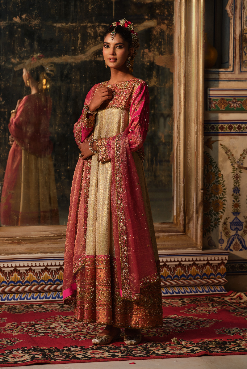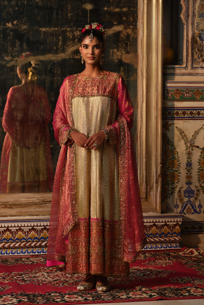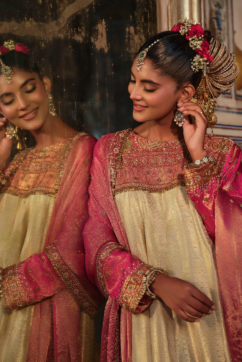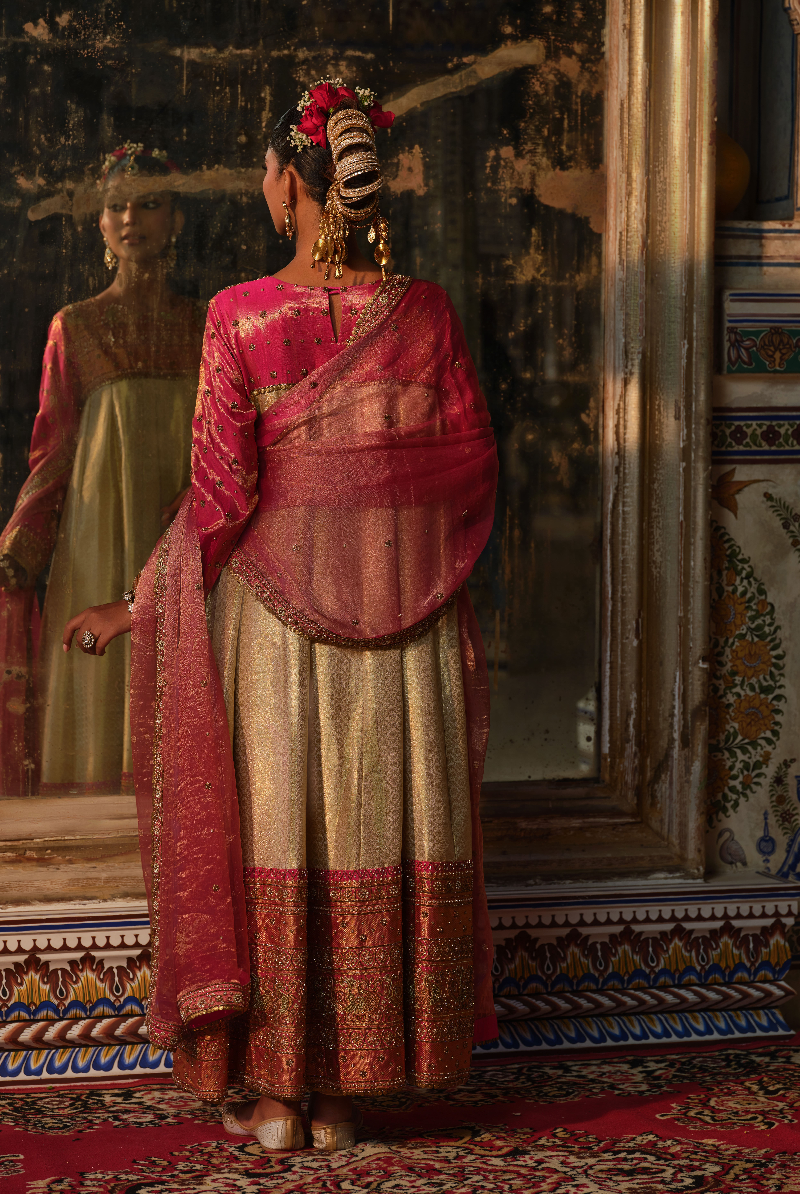 Rani Pink Pure Tissue Kanjeevaram hand embroidered Anarkali with Tisuue Dupatta.