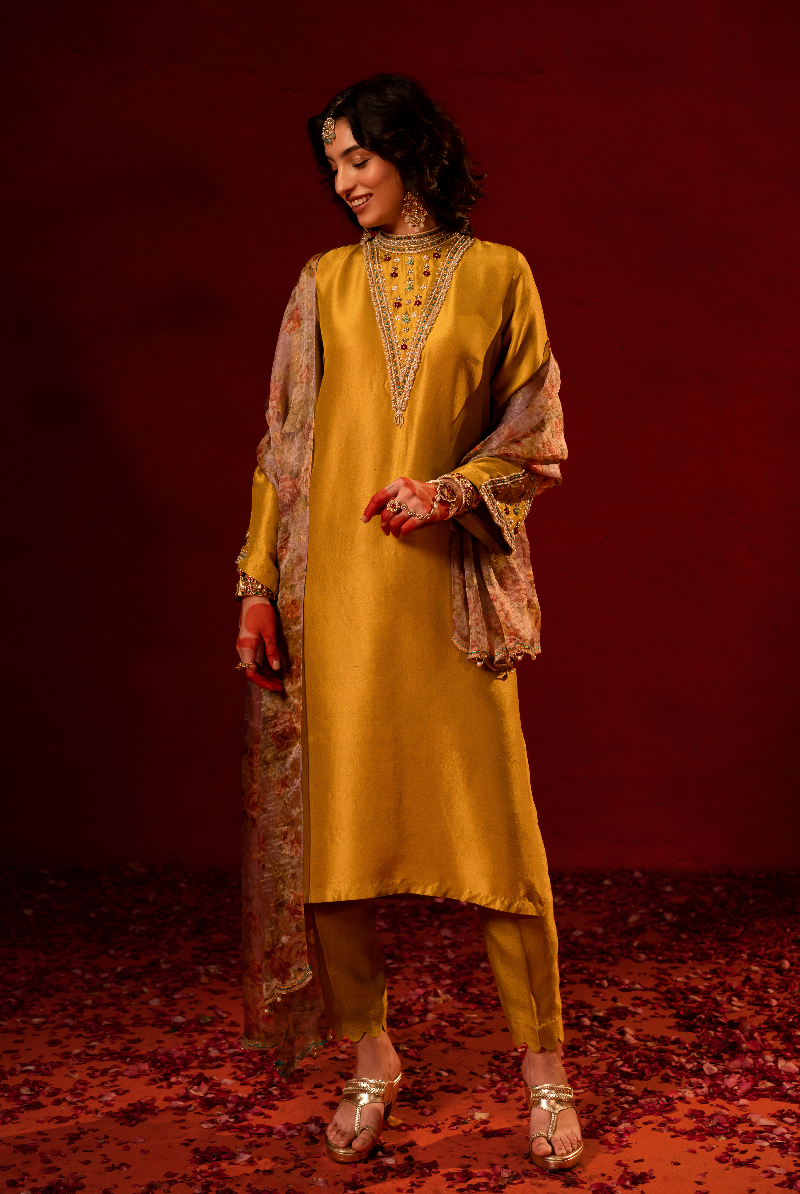 Bright Yellow Handcrafted kurta set.