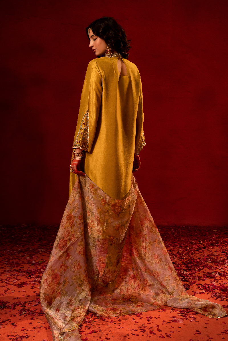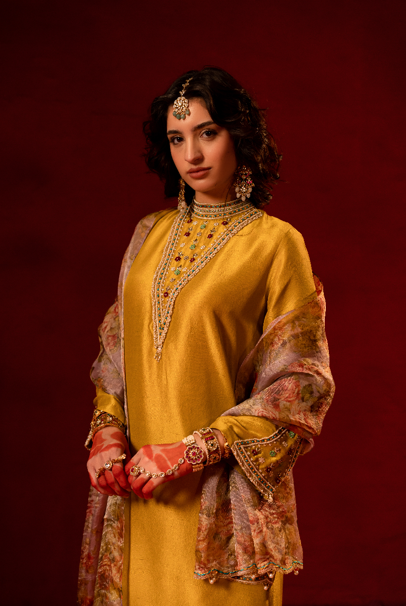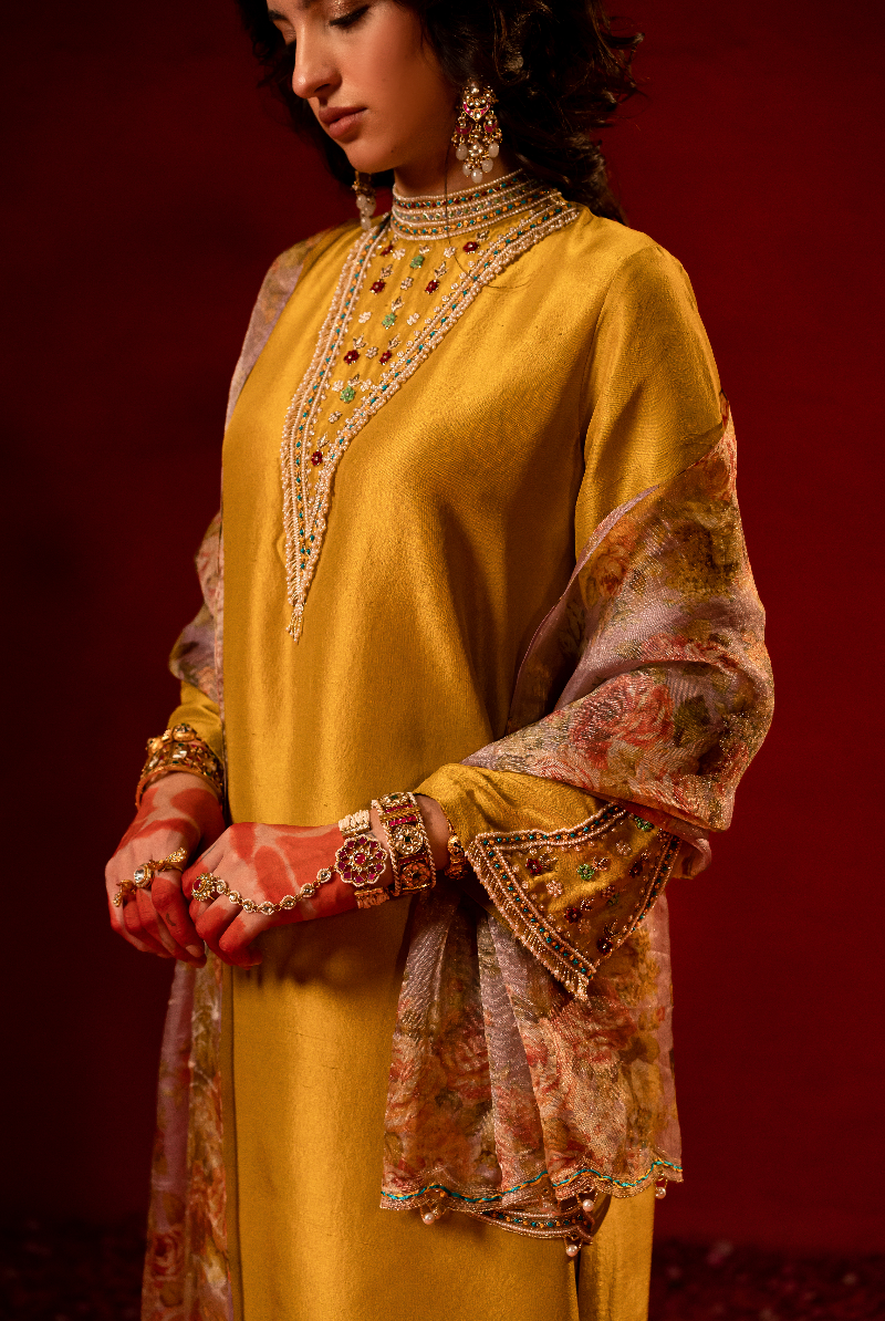 Bright Corn Yellow Hand Embellished Kurta With Pure Floral Tissue Dupatta.