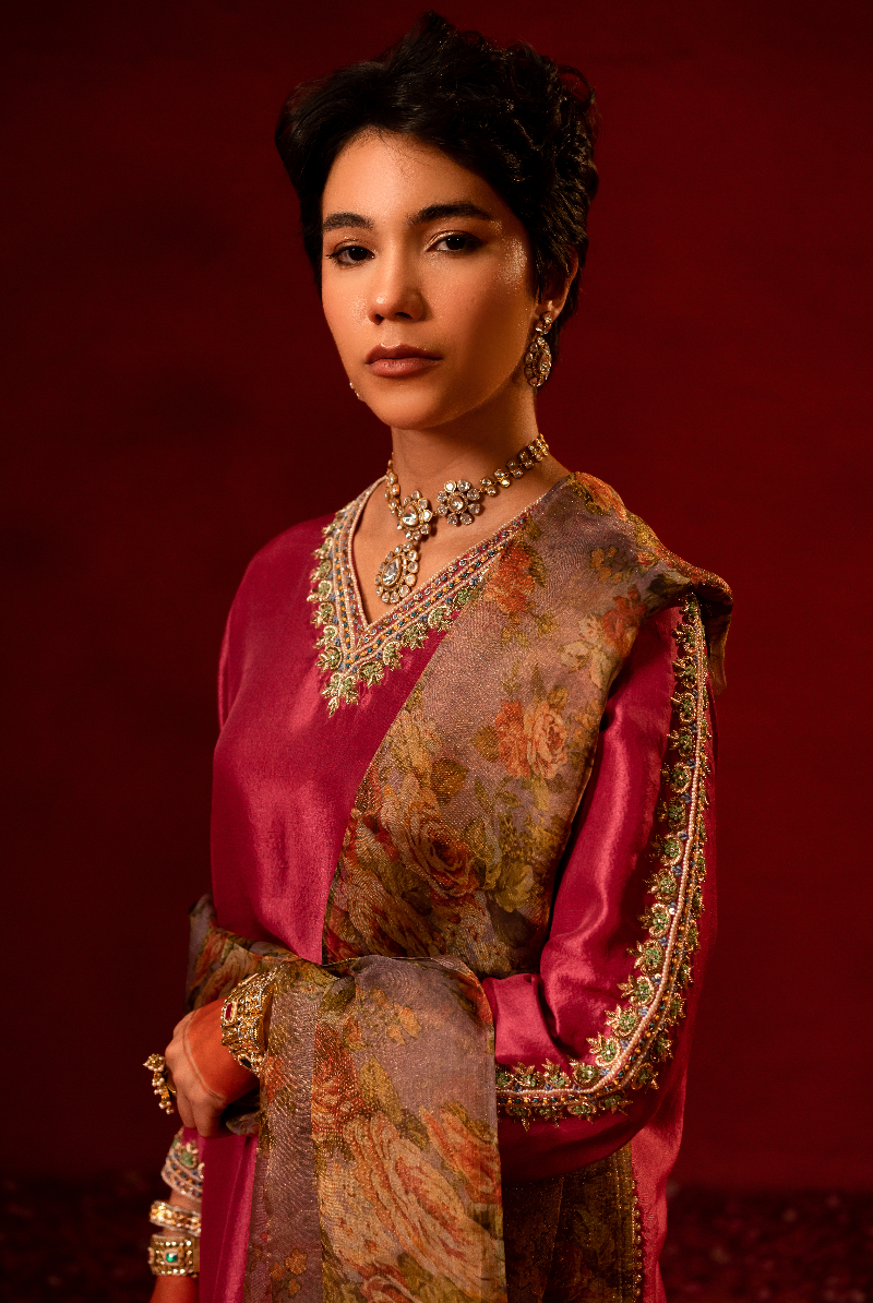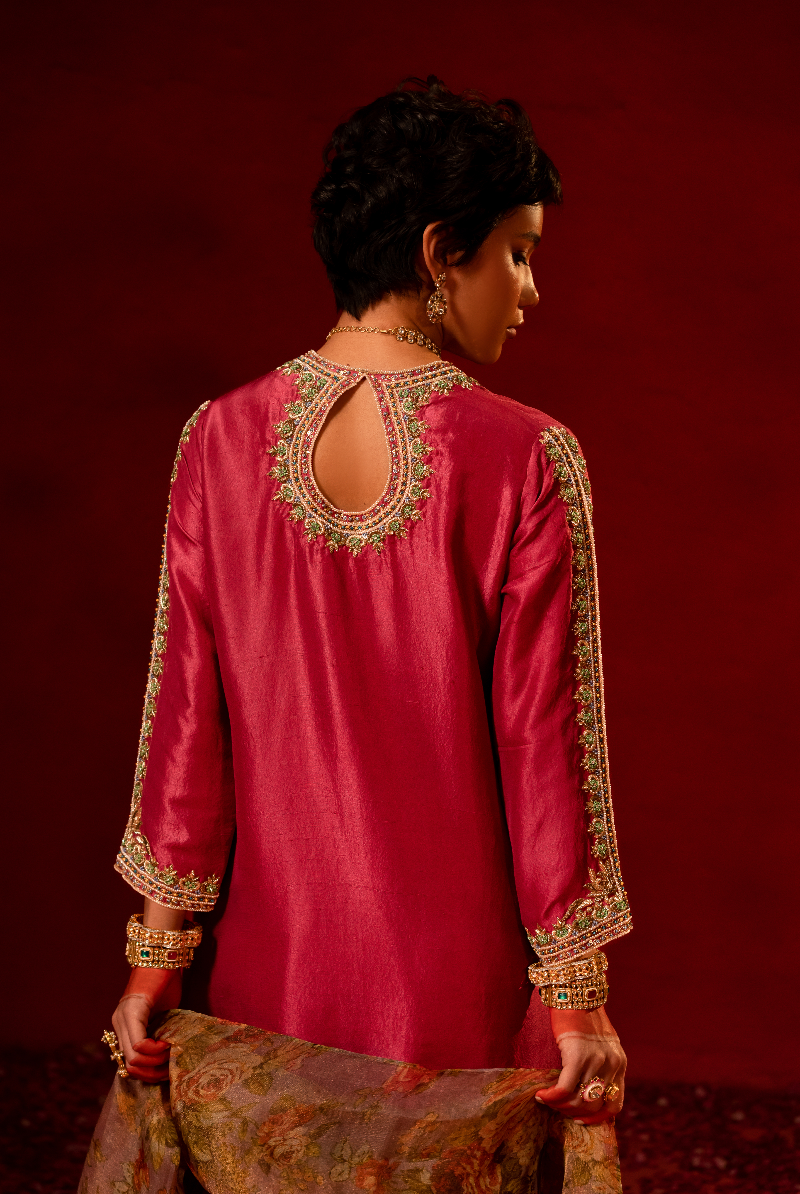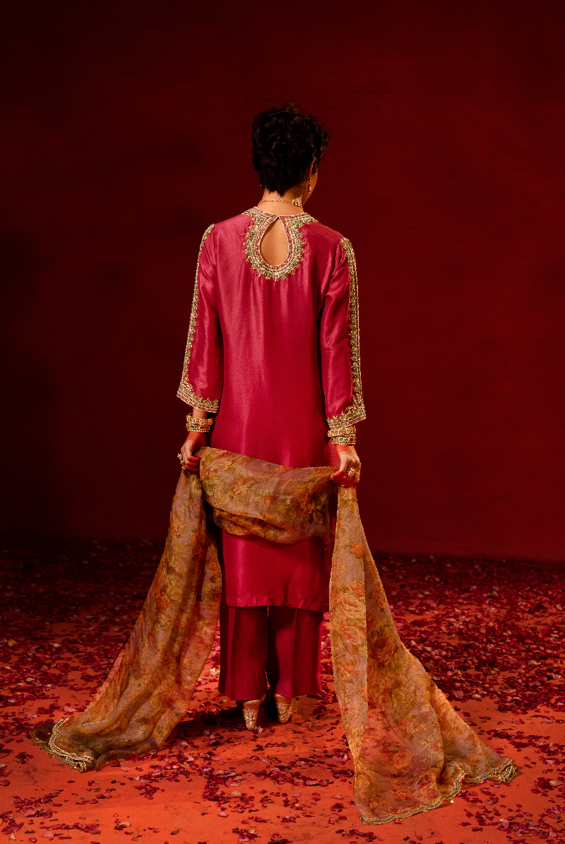 Magenta haze Placement Work Kurta with Pure Tissue Floral Dupatta.