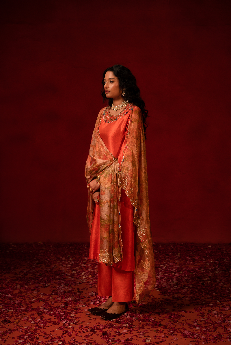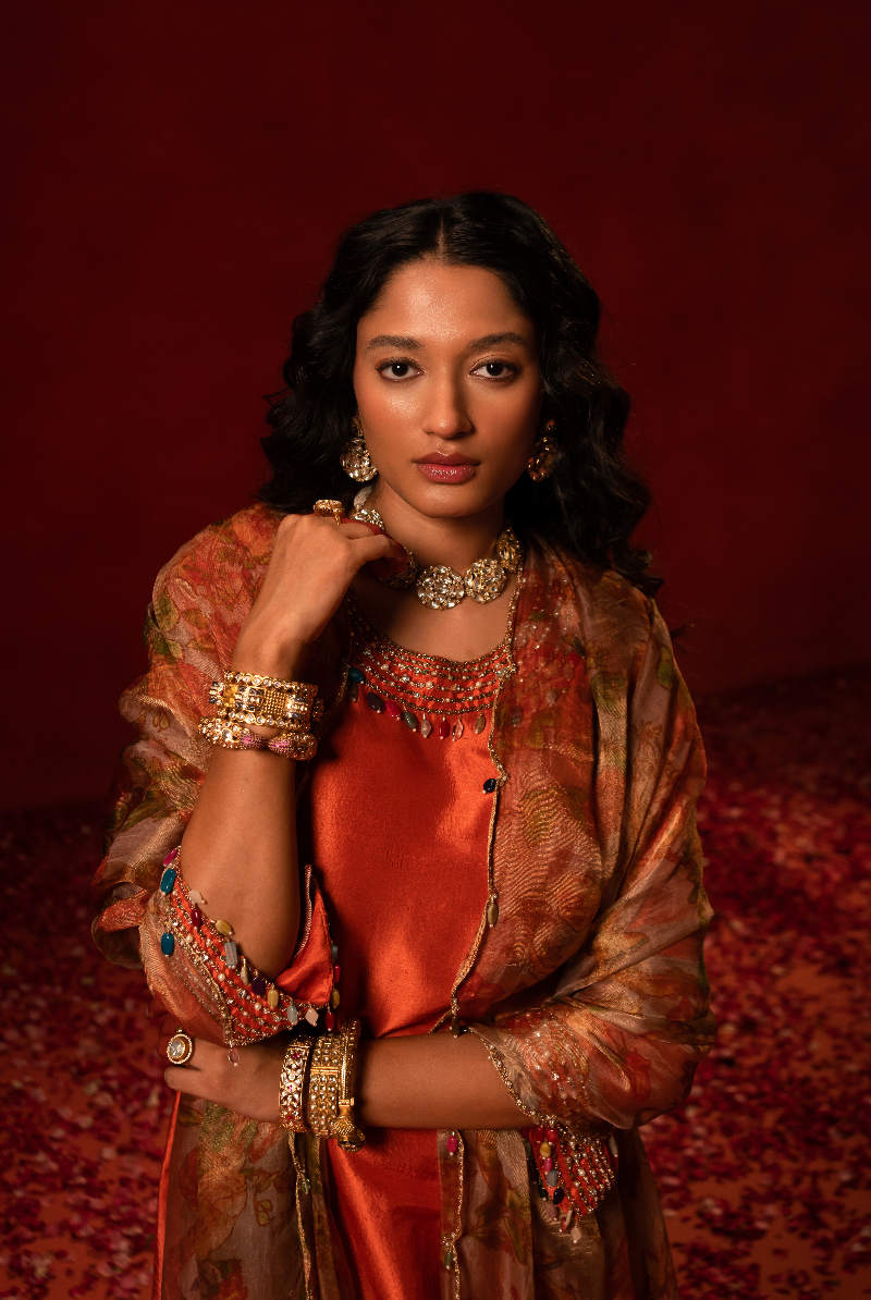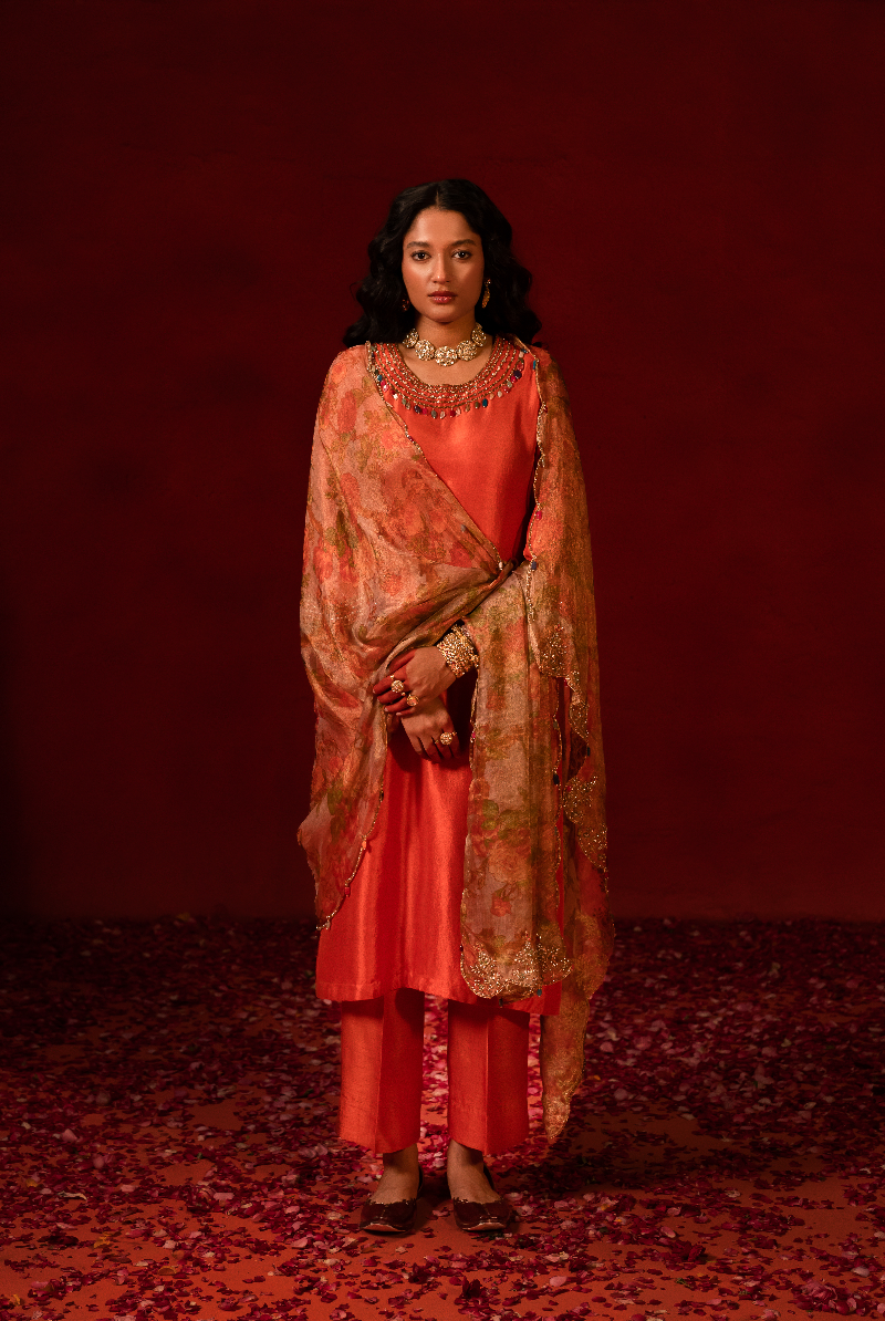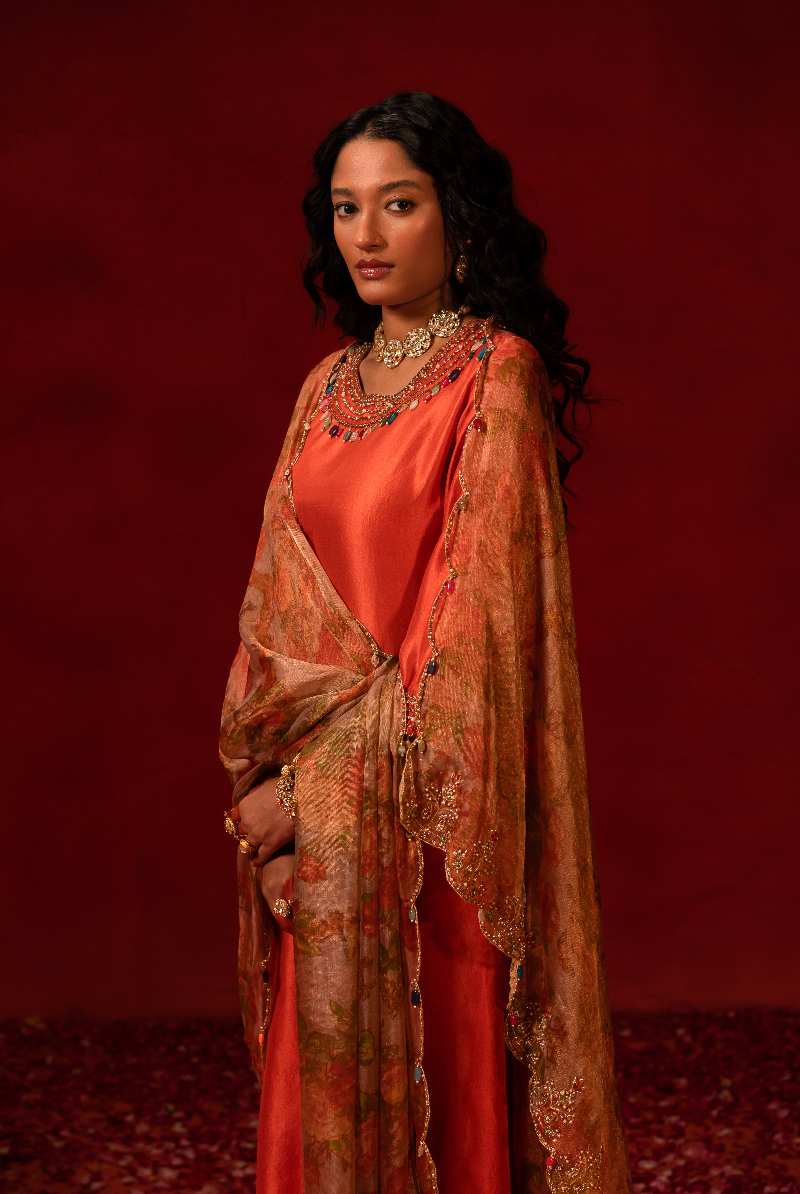 Rust Orange Kurta with Multi color Stone Work Enhanced with Floral Tissue Dupatta.