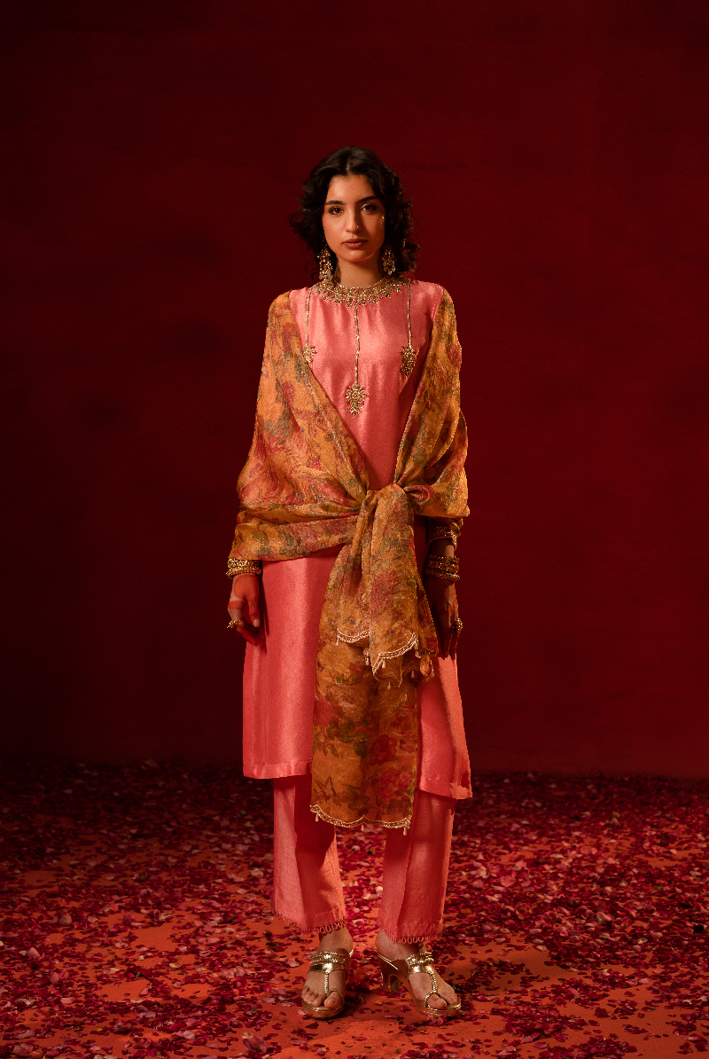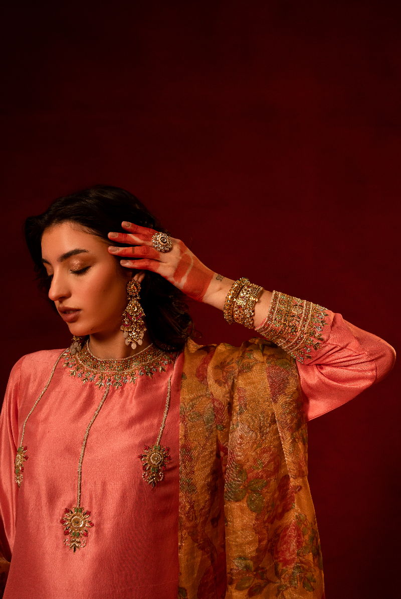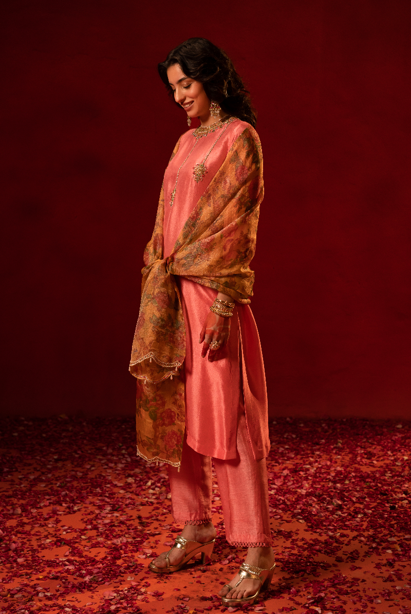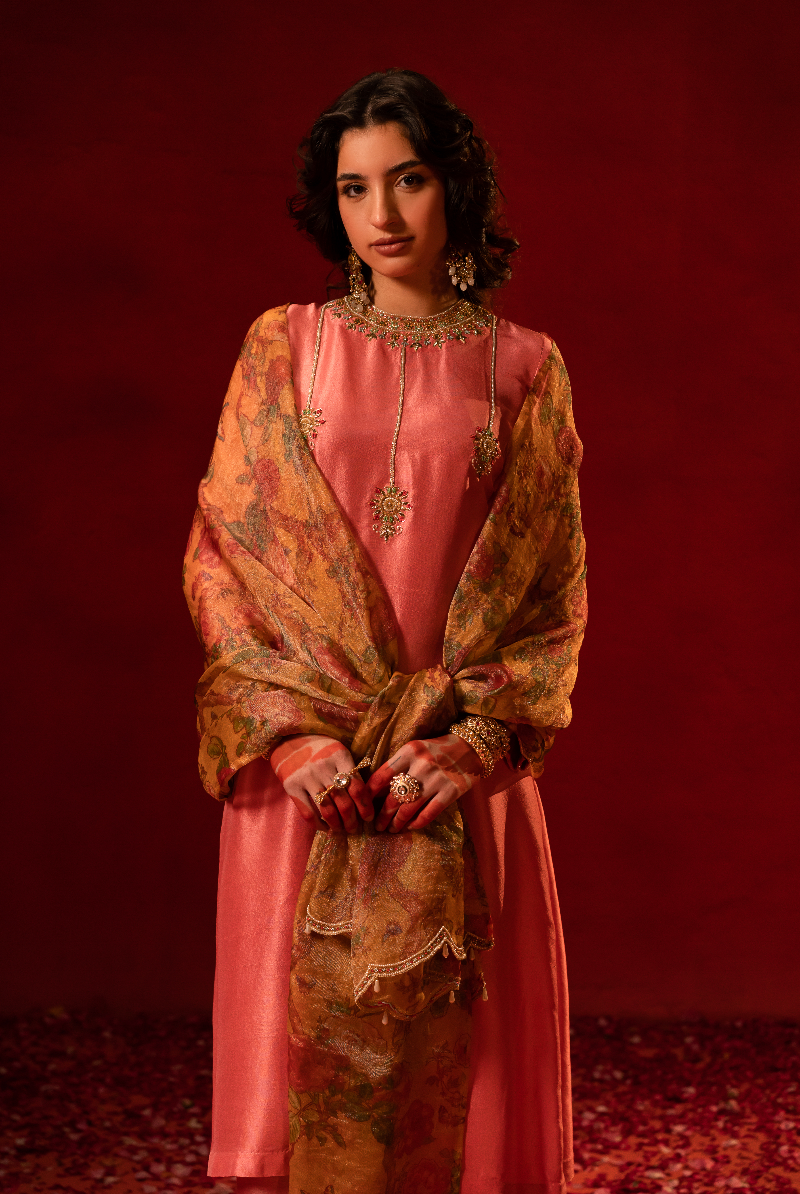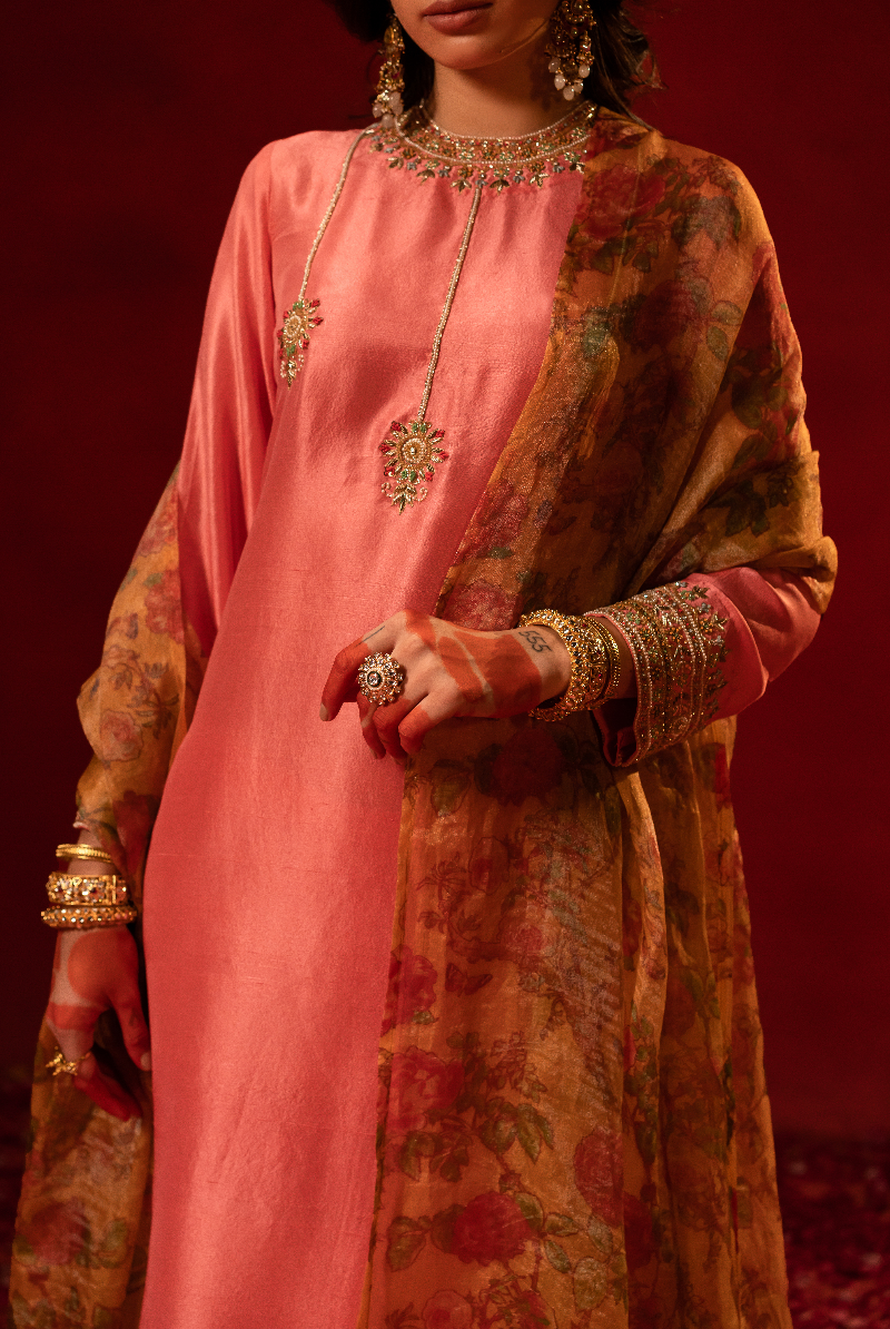 Salmon Pink Handcrafted Placement work Kurta with Floral Tissue Dupatta.