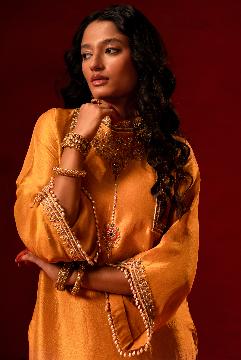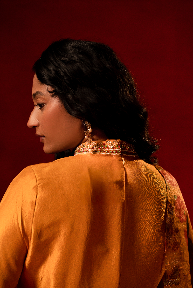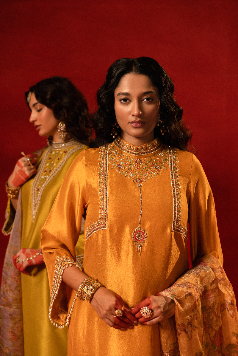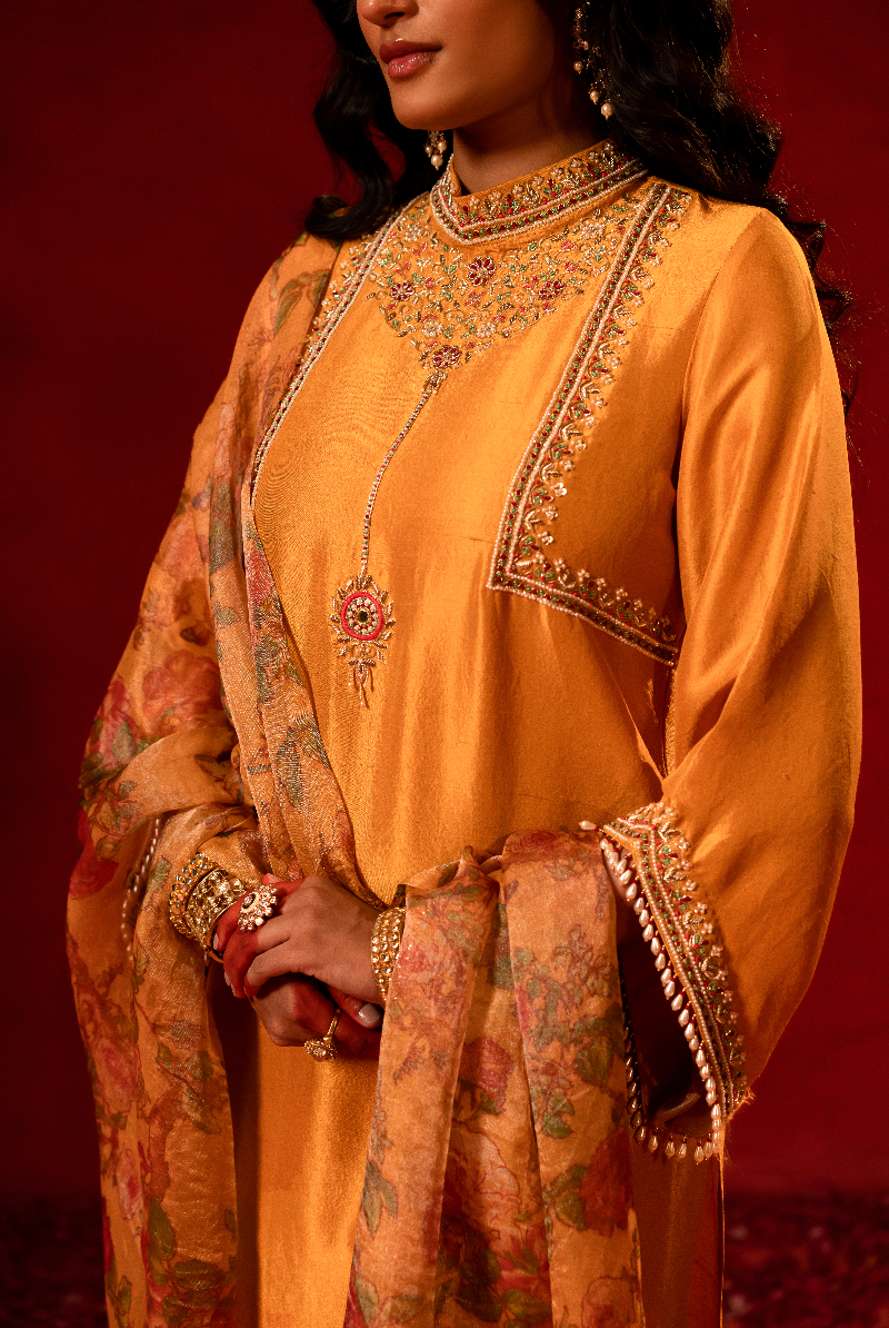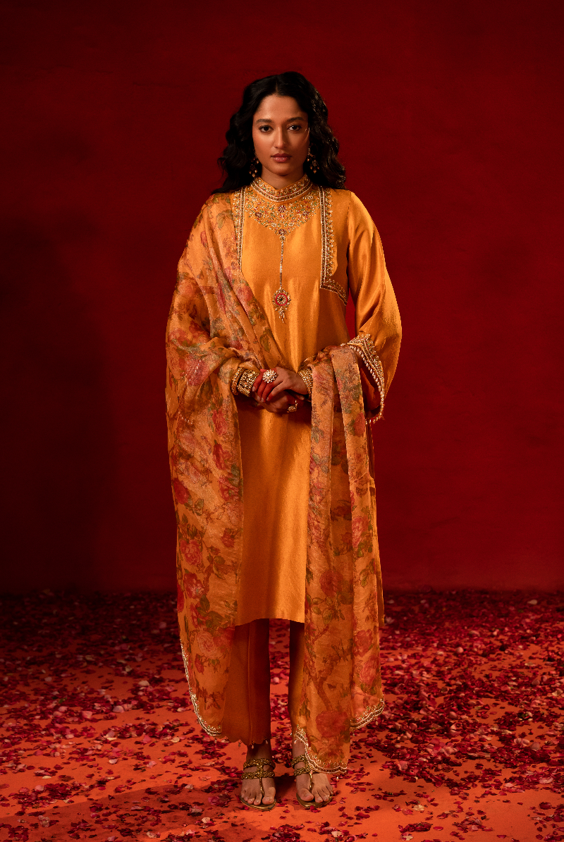 Sunshine Yellow Placement work kurta with Pure floral tissue Dupatta.