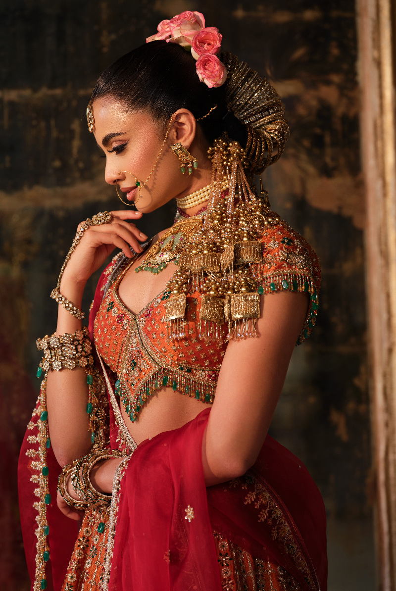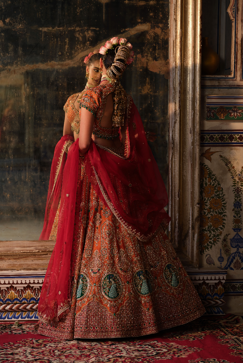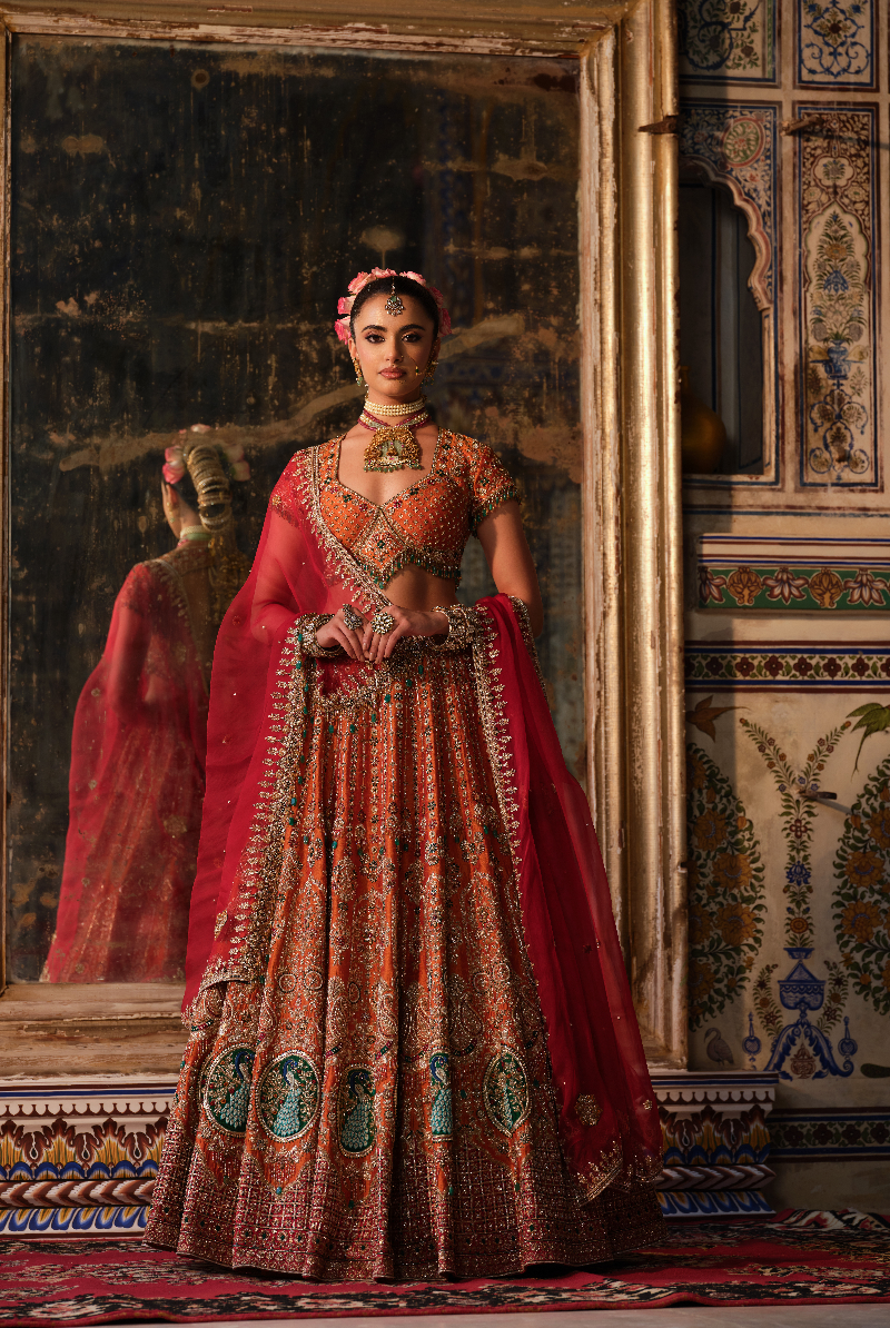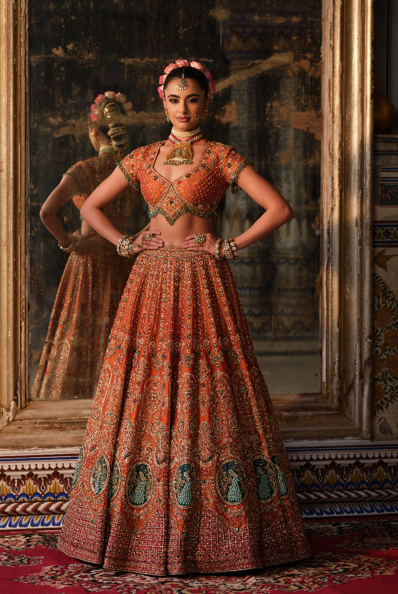 Burnt orange lehenga with intricate embroidery and peacock medallion, paired with organza dupatta.