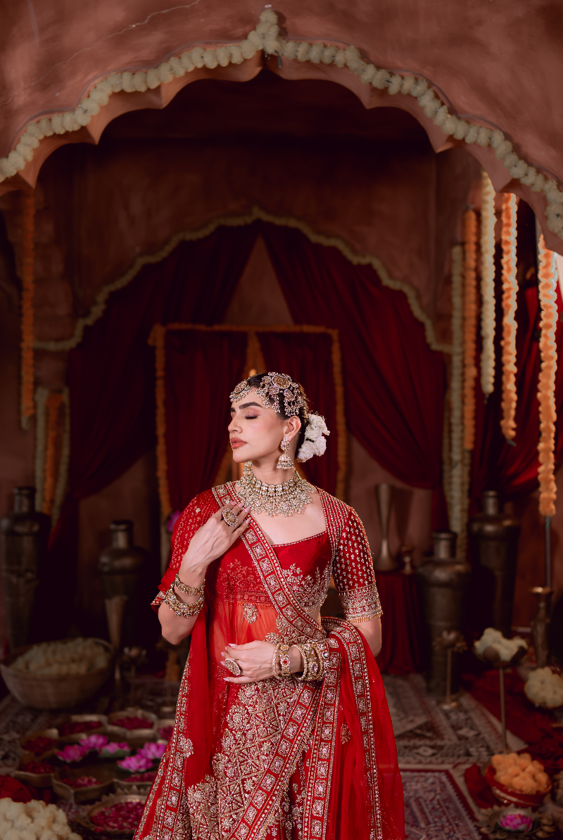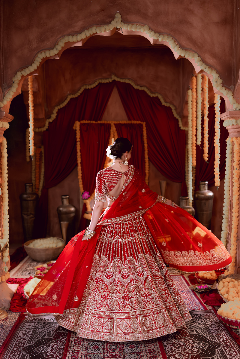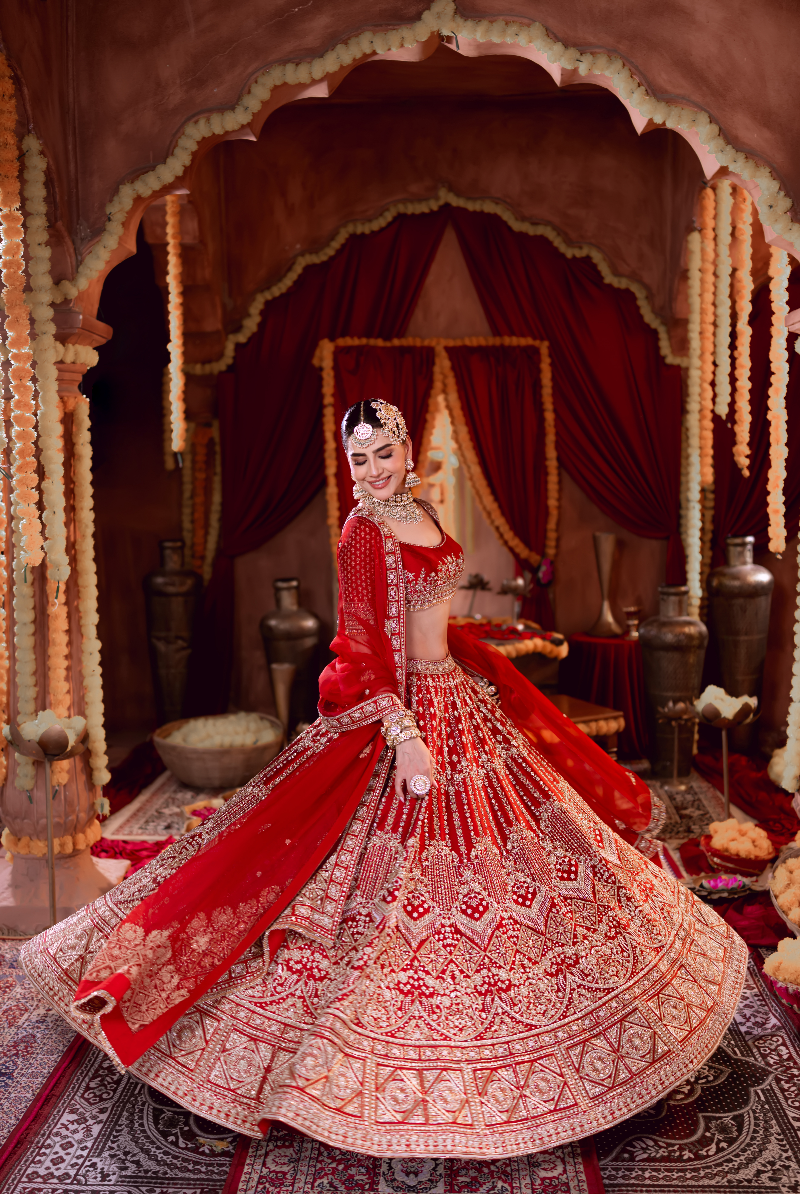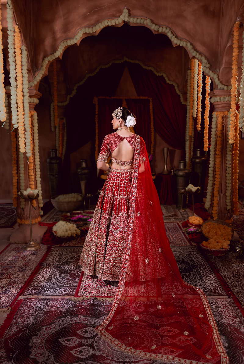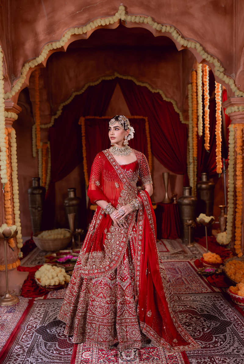 A regal crimson maroon lehenga with intricate hand embroidery and an organza dupatta with fine borders.