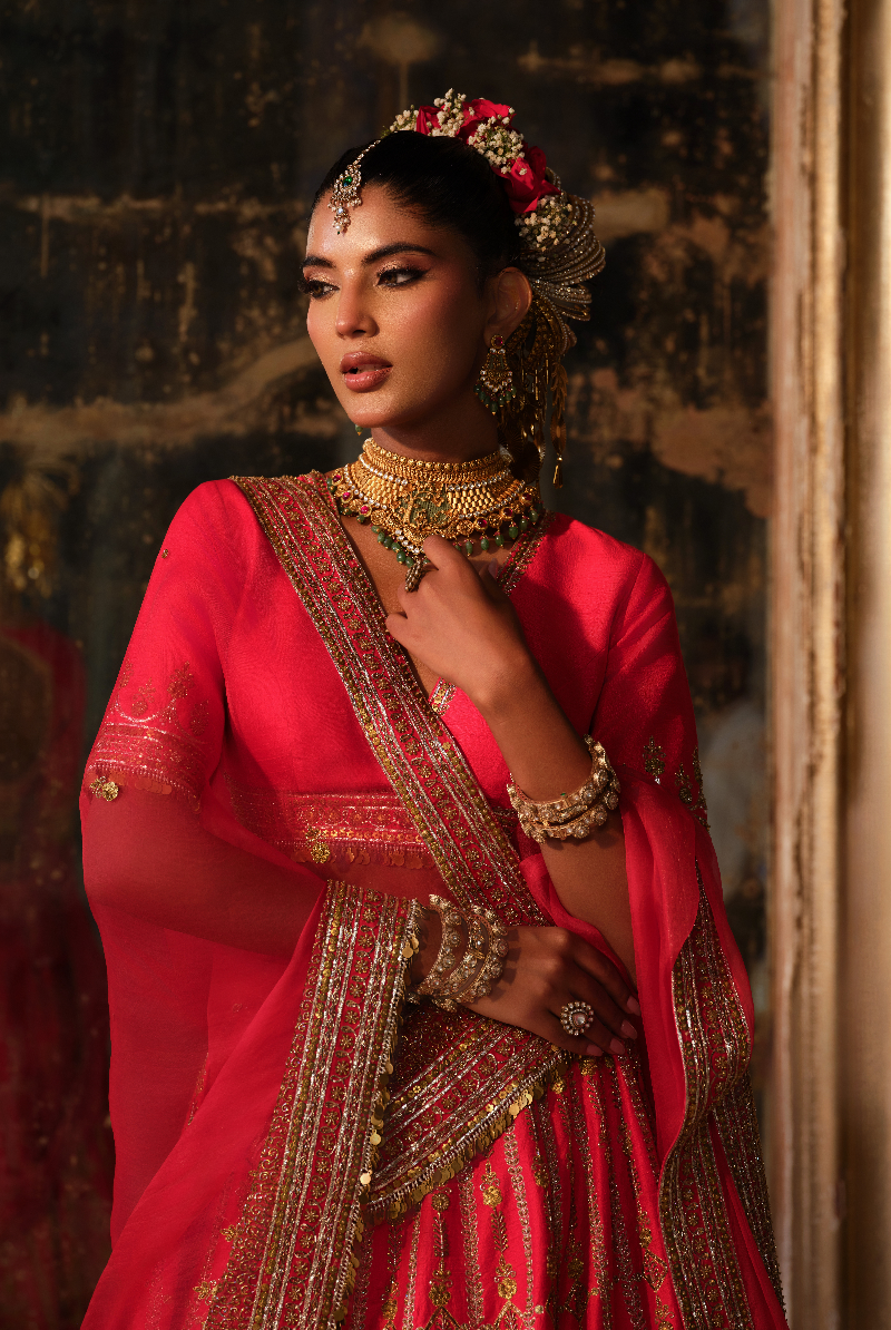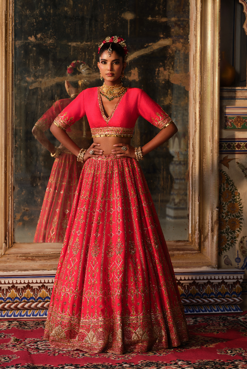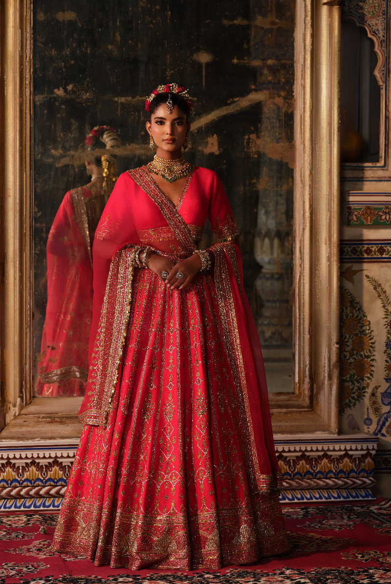 A Vibrant Vermilion Lehenga Set with Gold Embroidery.