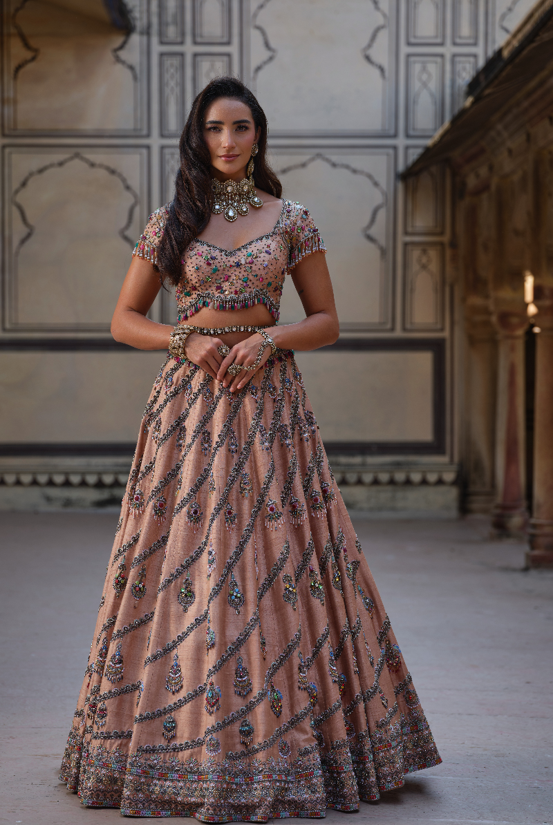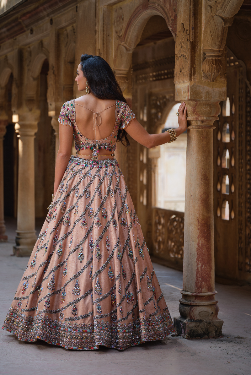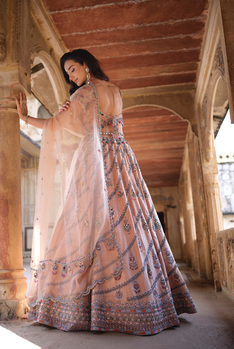 Blush Pink Hand Crafted Chandbali Lehenga Set.