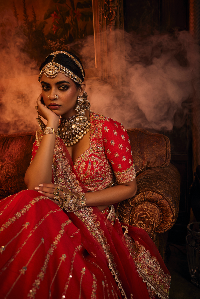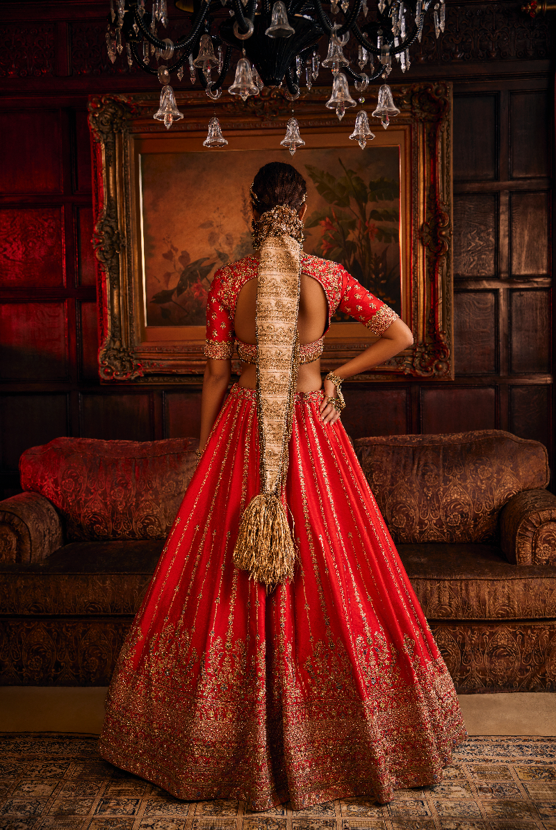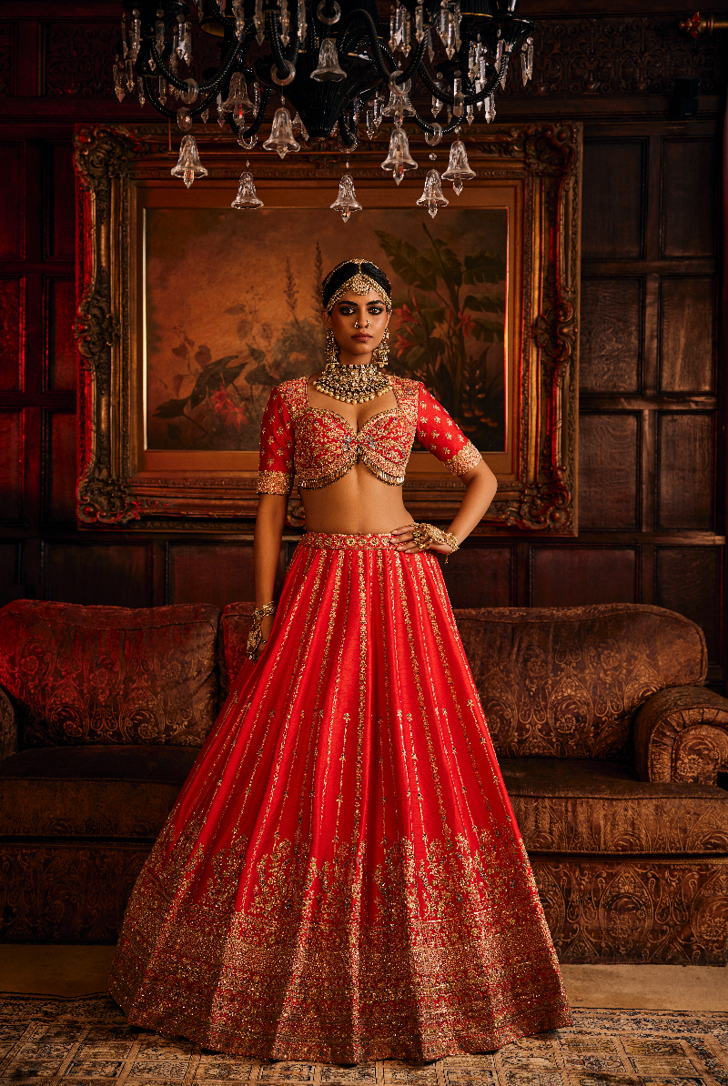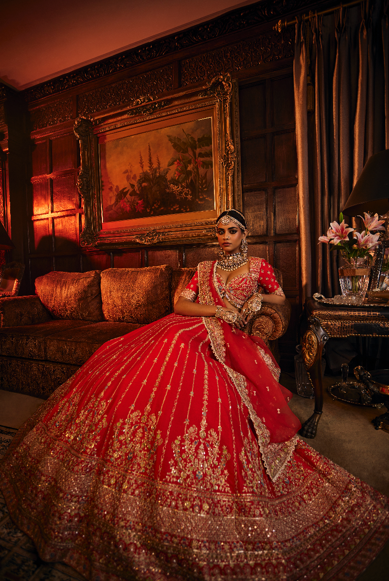 DILRUBA, Bright Red Lehenga set hand embellished in pearl, zardosi and resham