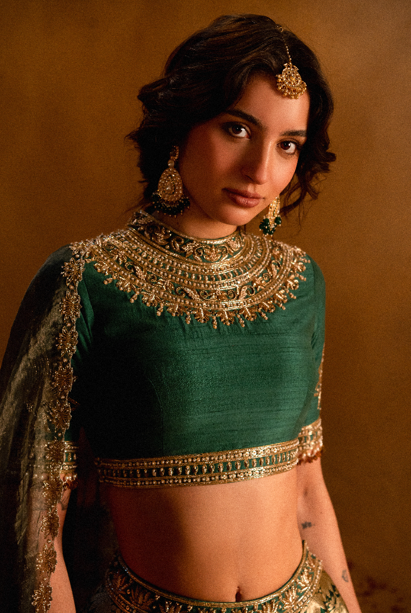Dark Green Banarasi Gold Zari Lehnga set .