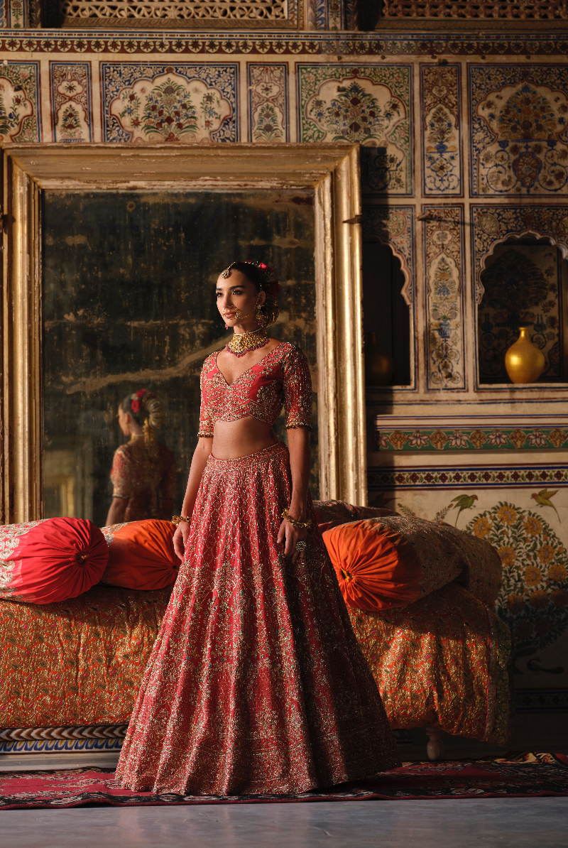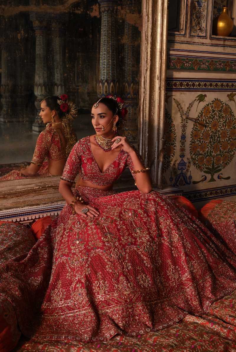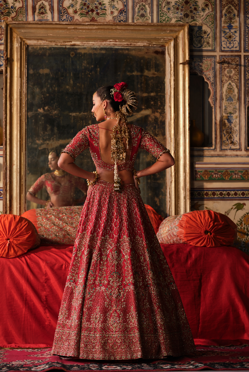 Dark Red lehenga with intricate gold zari, zardosi, resham, and pearl embroidery, paired with a matching embellished dupatta.