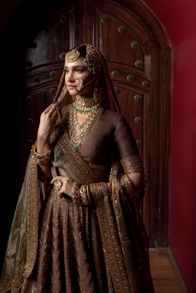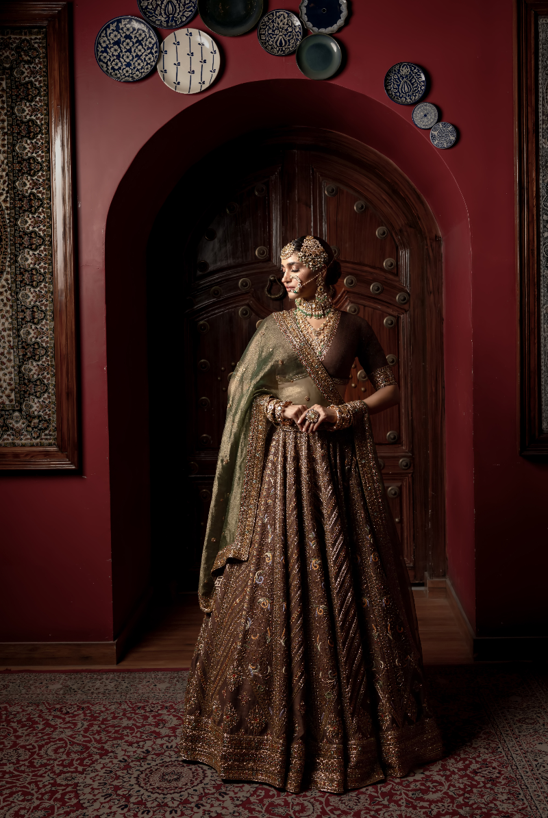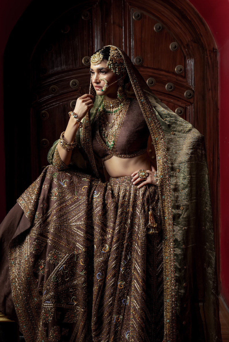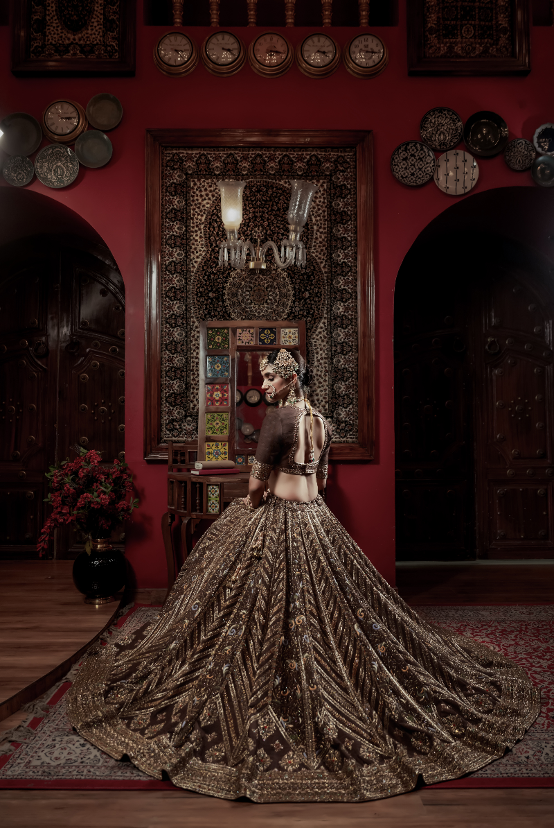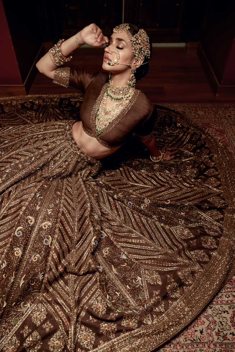 Deep Mocha Brown a classic elegance in Pure raw Silk Hand Embroidered Lehenga Set