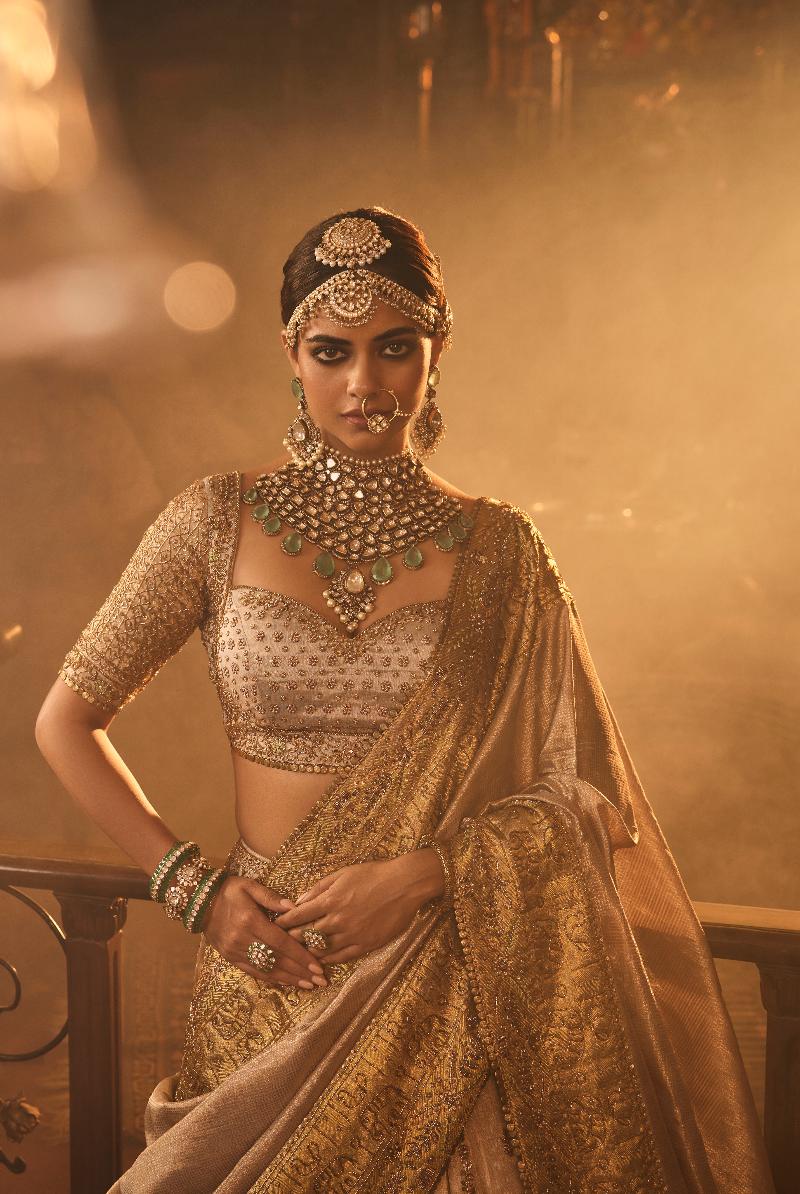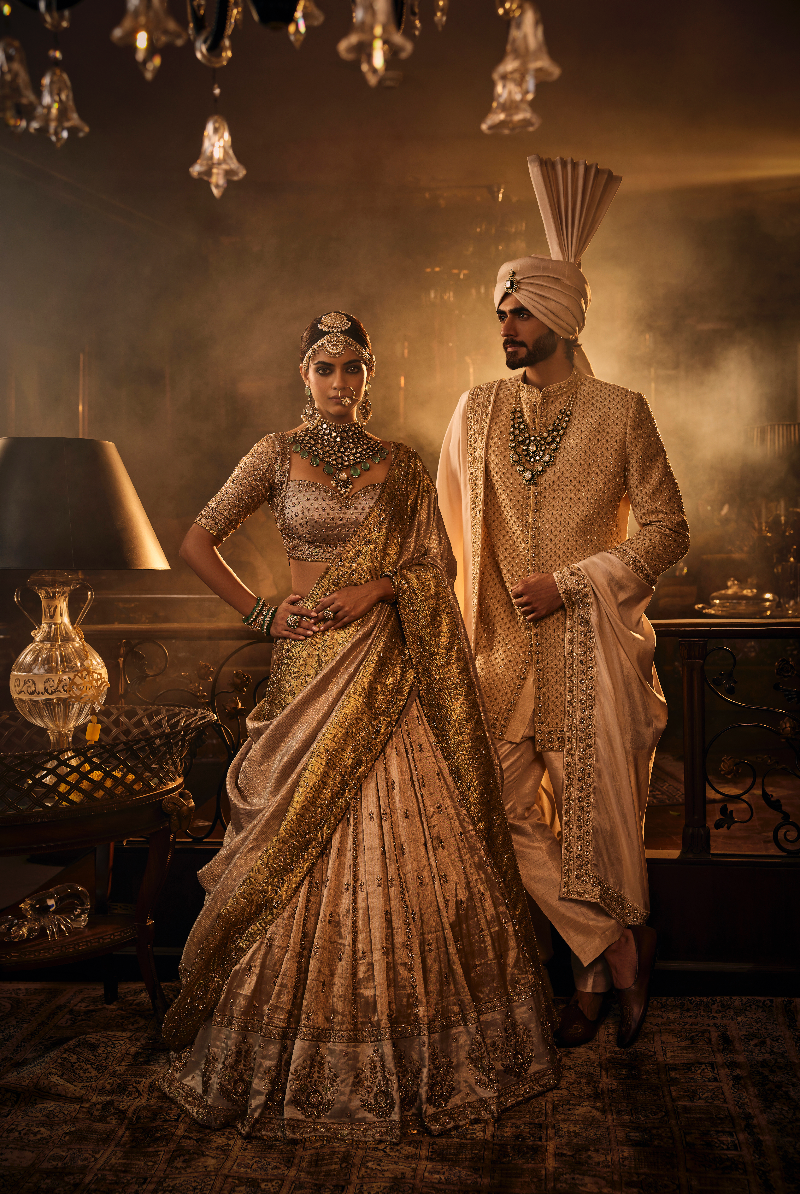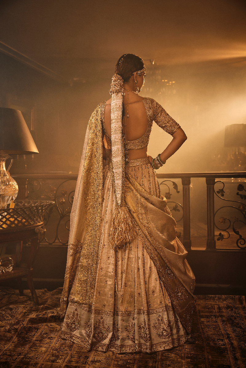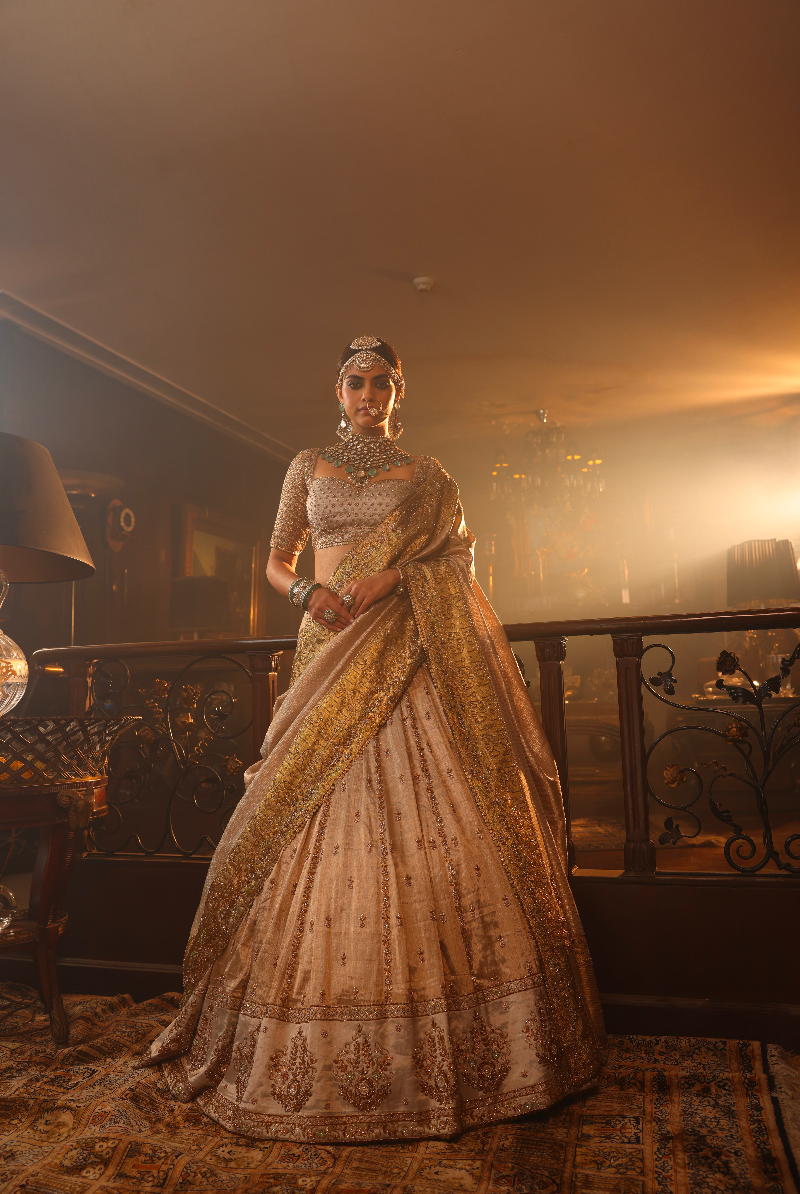 SUNEHARI, Gold Copper Tissue Lehnga Set with pure gold tissue dupatta.