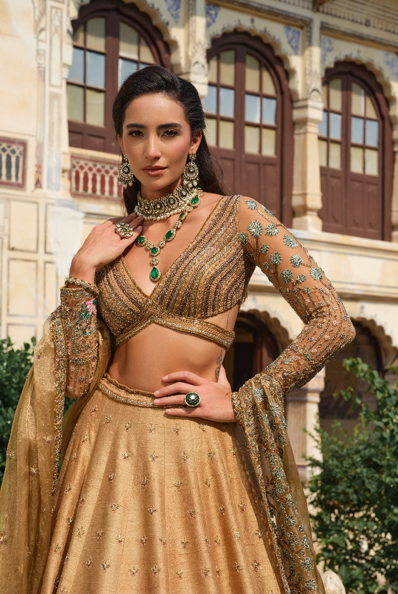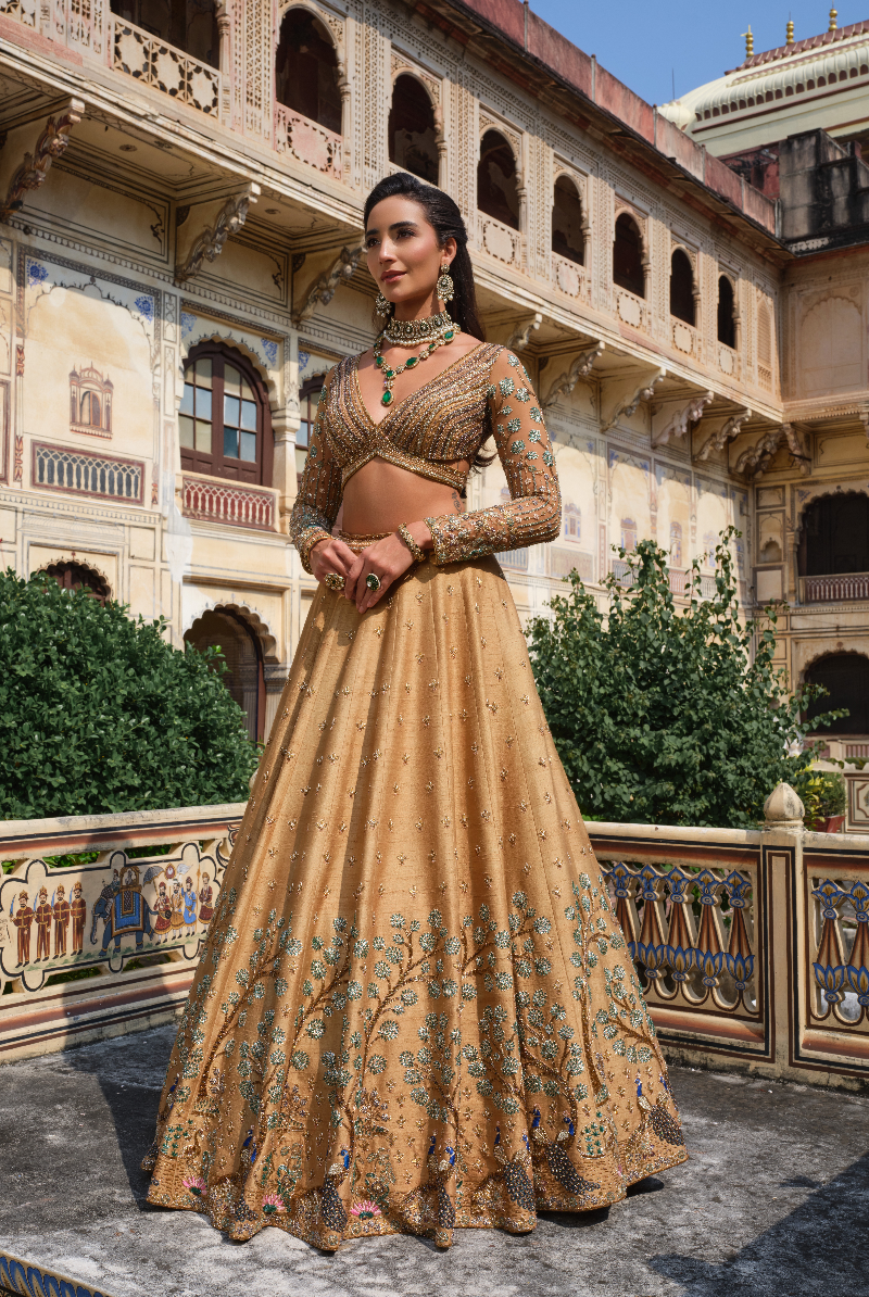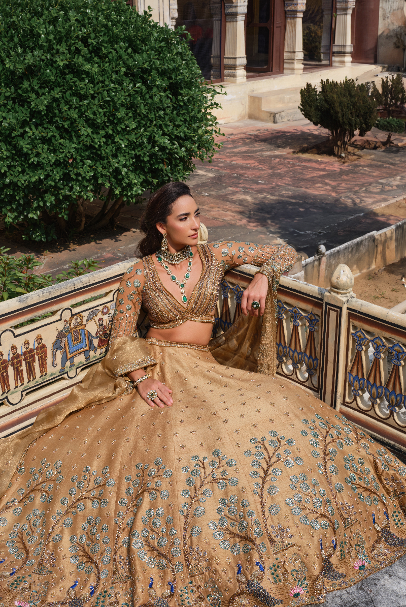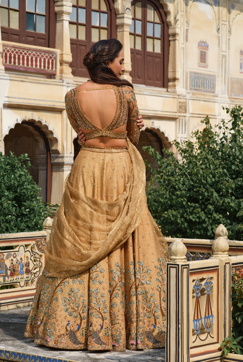 Gold lehenga with floral and peacock motifs, paired with an embroidered tissue dupatta.