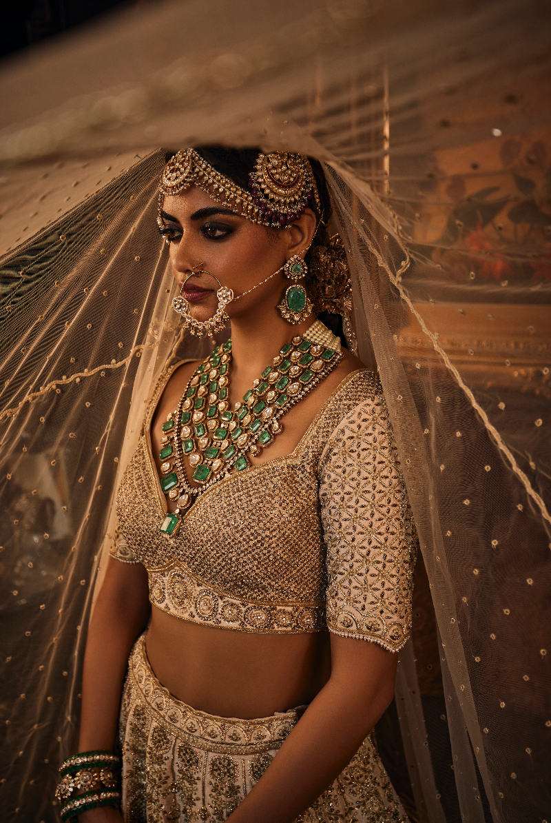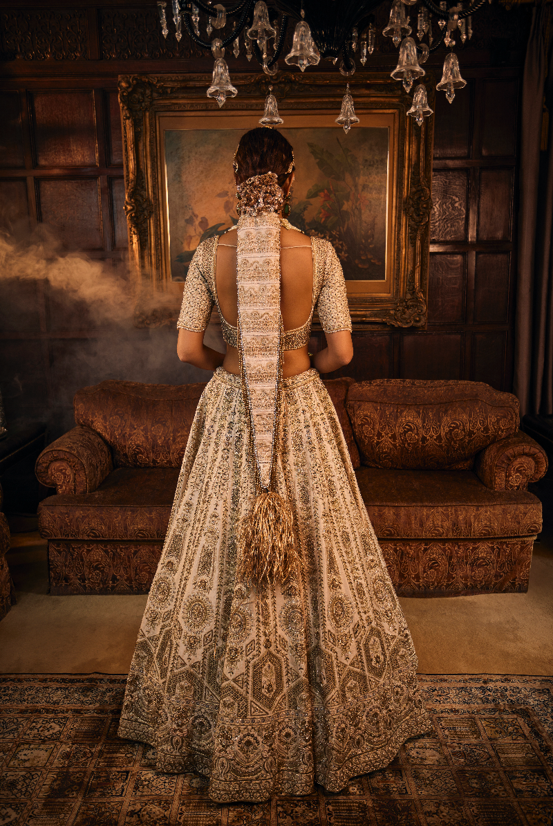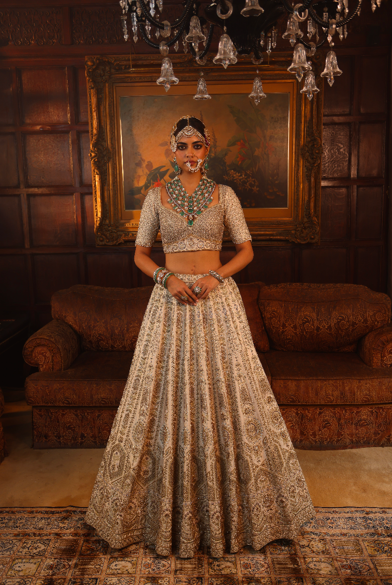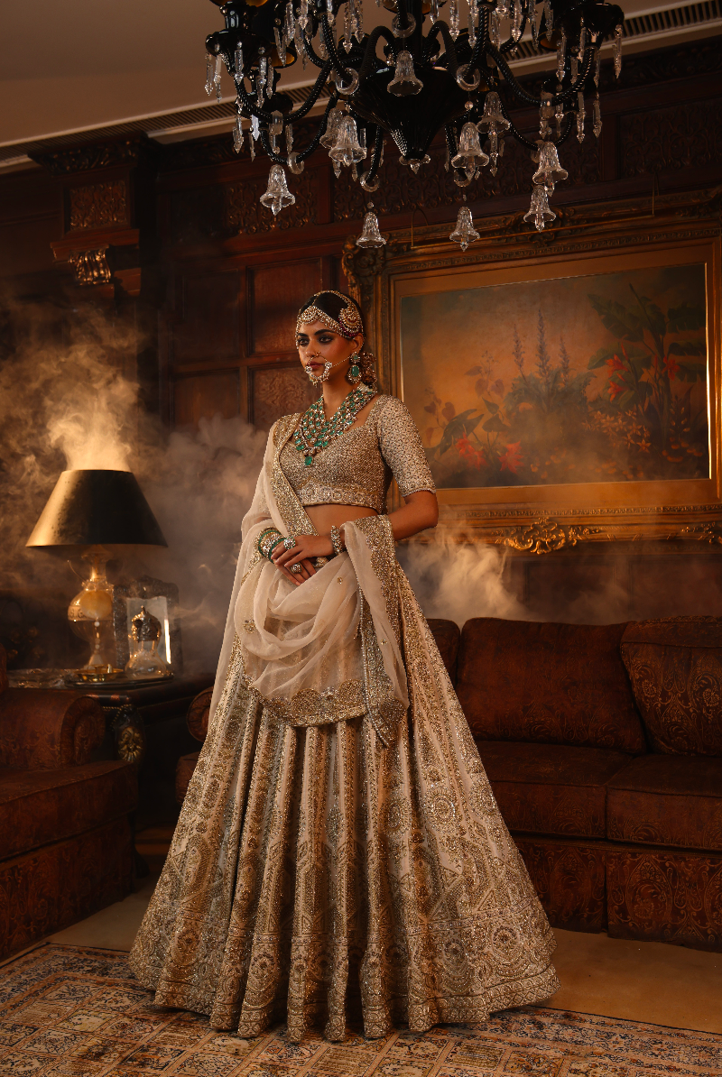 ZARKASH,Ivory Gold Lehnga in pure raw silk embroidered in zardosi work