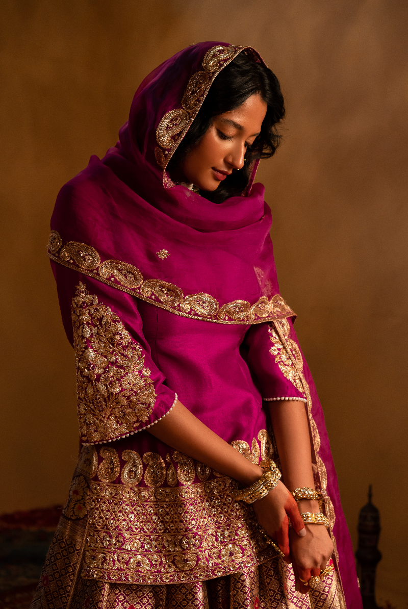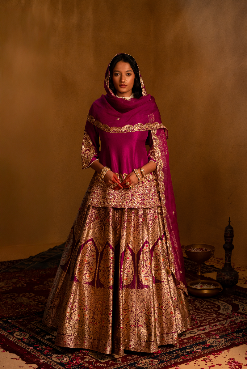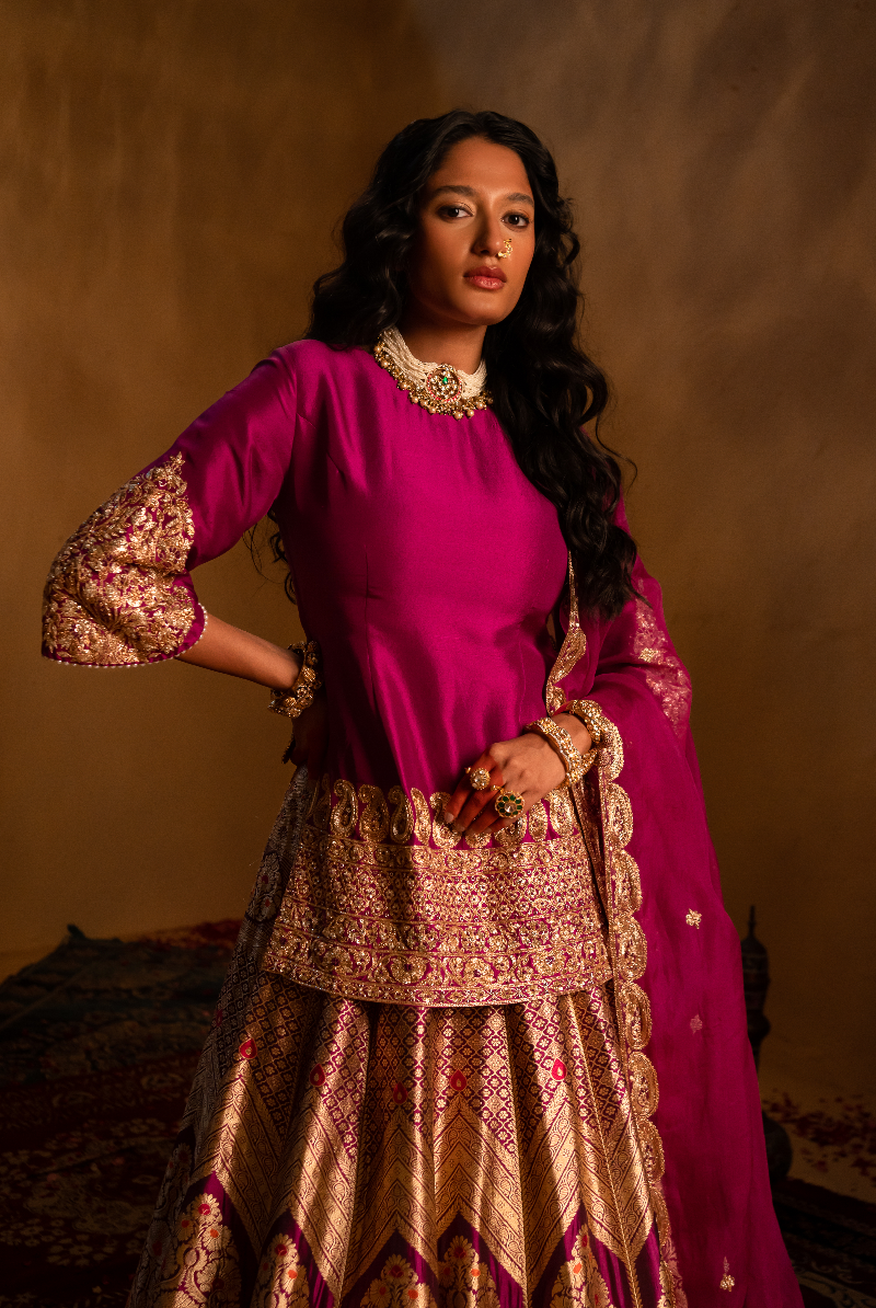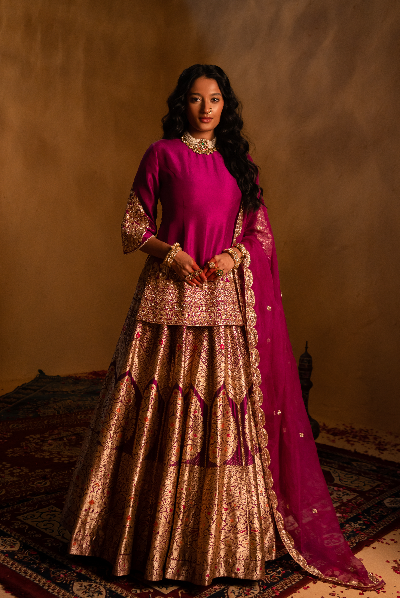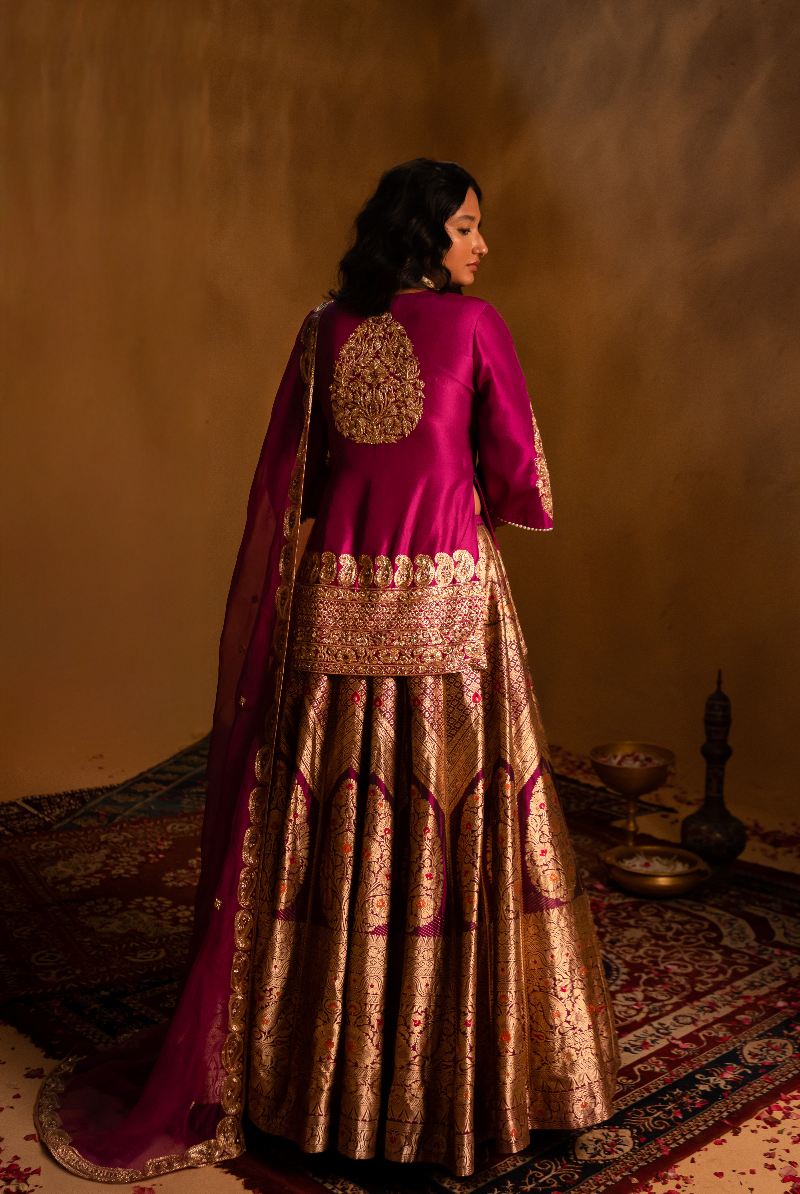 Magenta Rose Pure Banarasi Hand crafted Lehnga with Short Kameez.