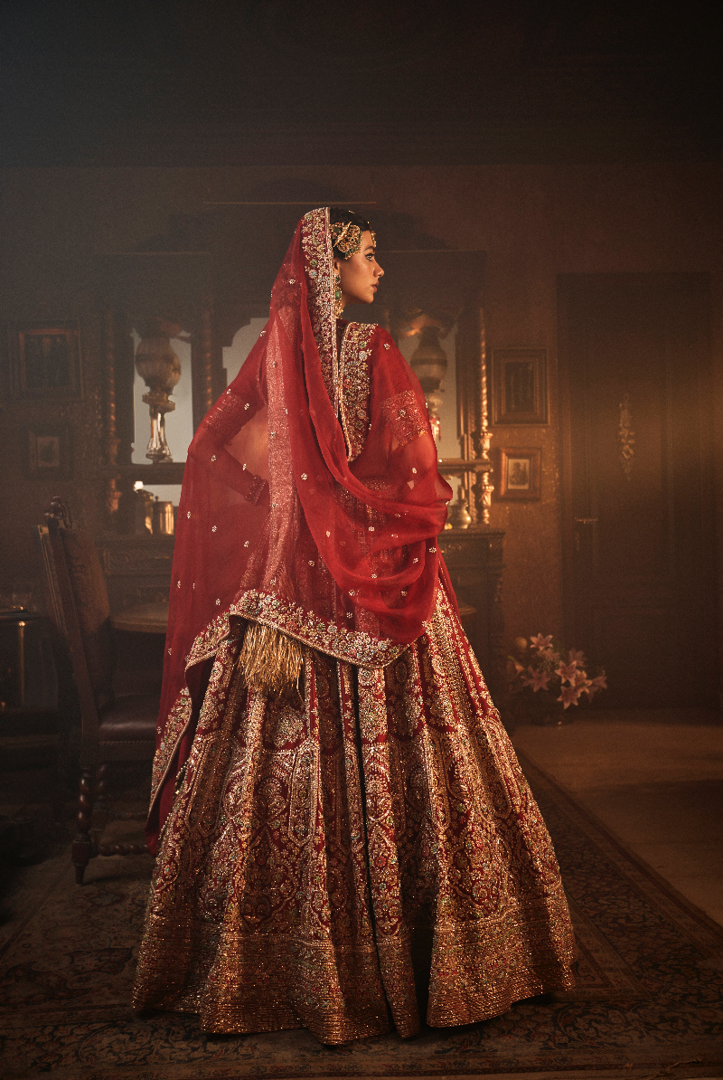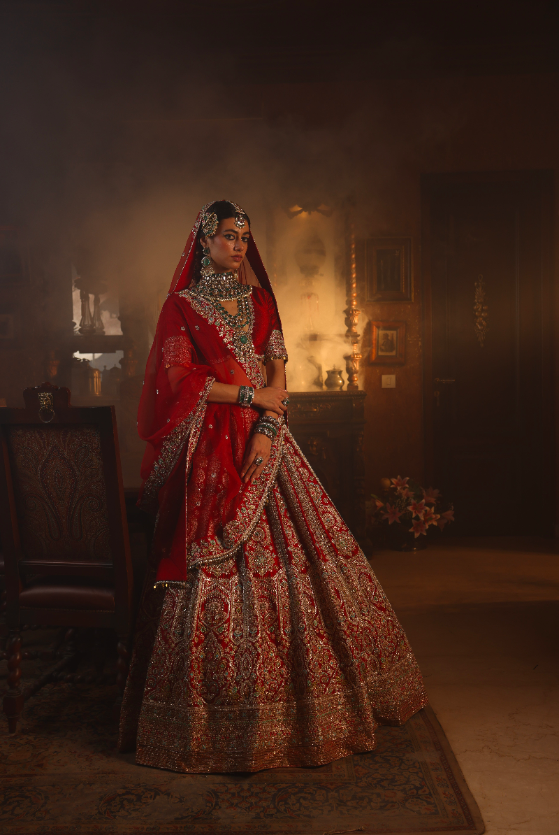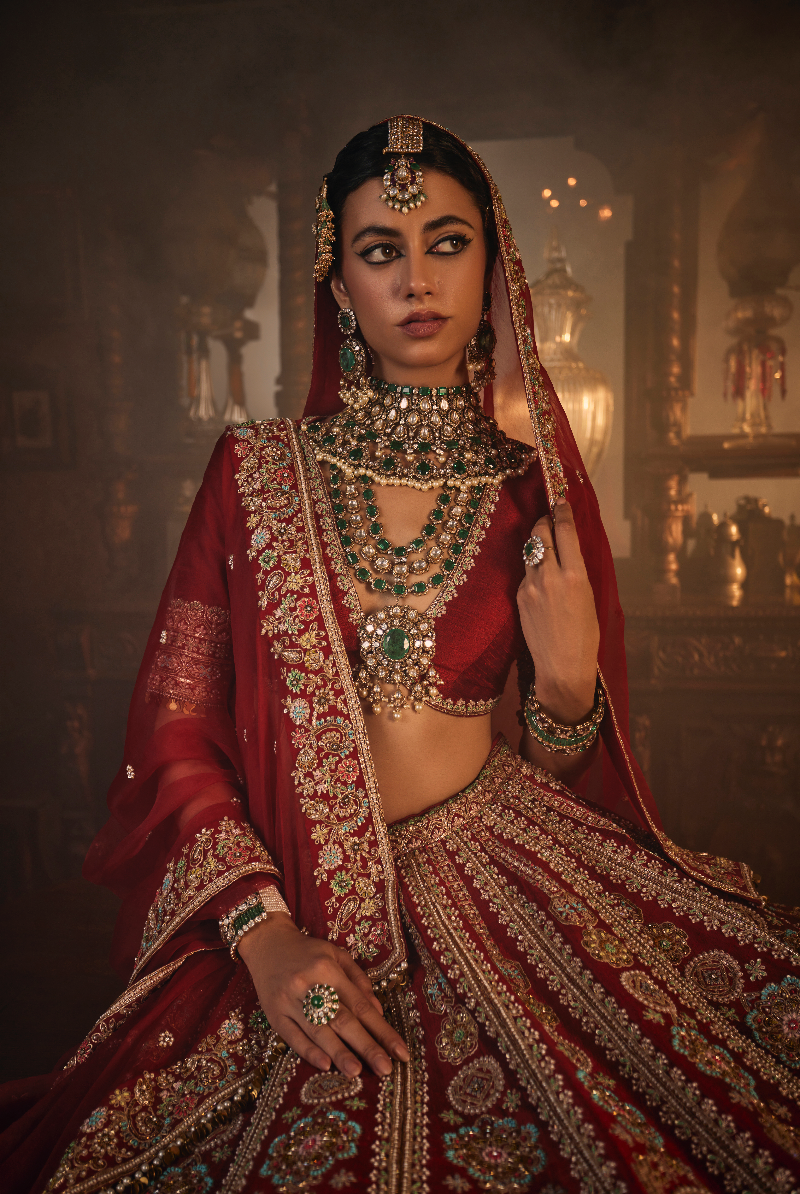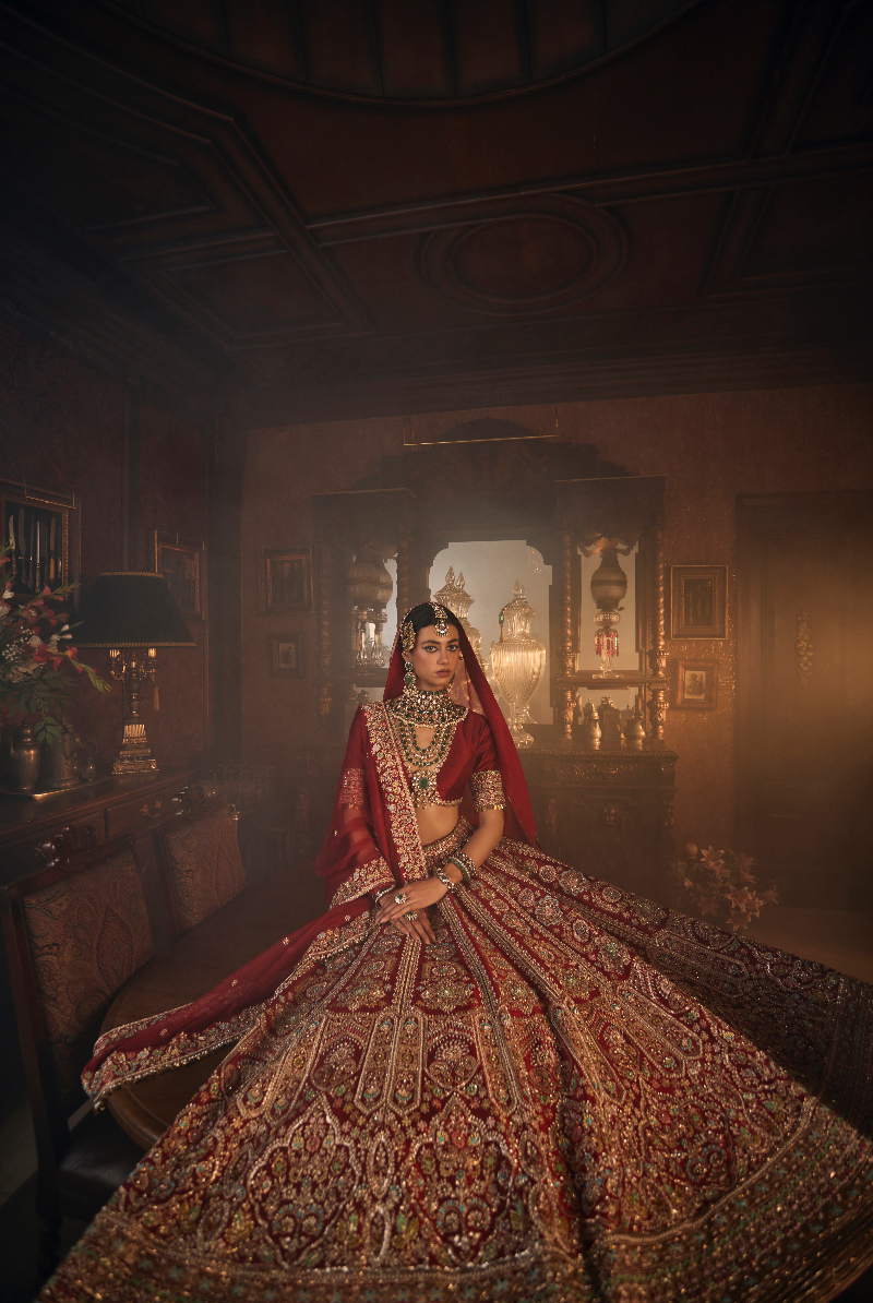 AQEEQ, A Royal Maroon Red raw silk lehenga in zardosi and pearl work.