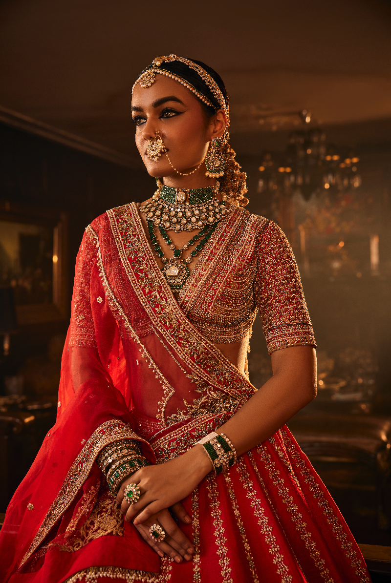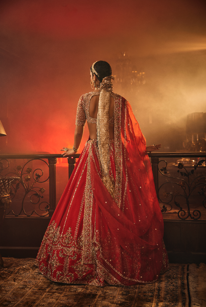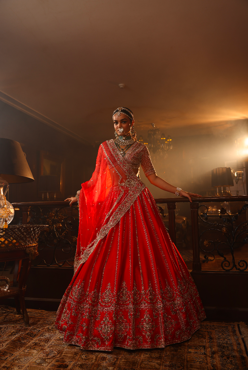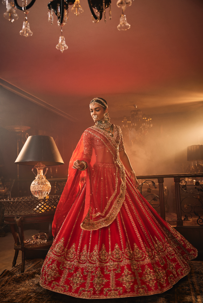 SURKH, Red Raw silk Lehenga Hand embroidered in Zardosi work, Paired with organza dupatta.