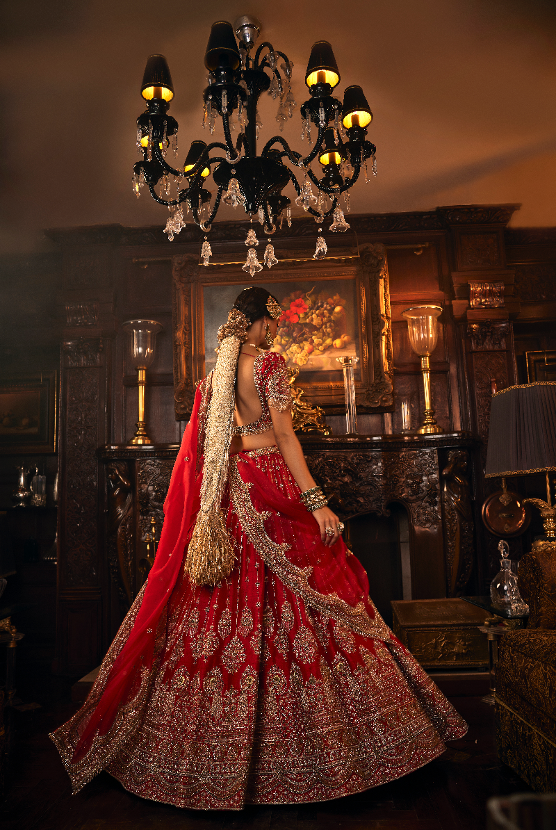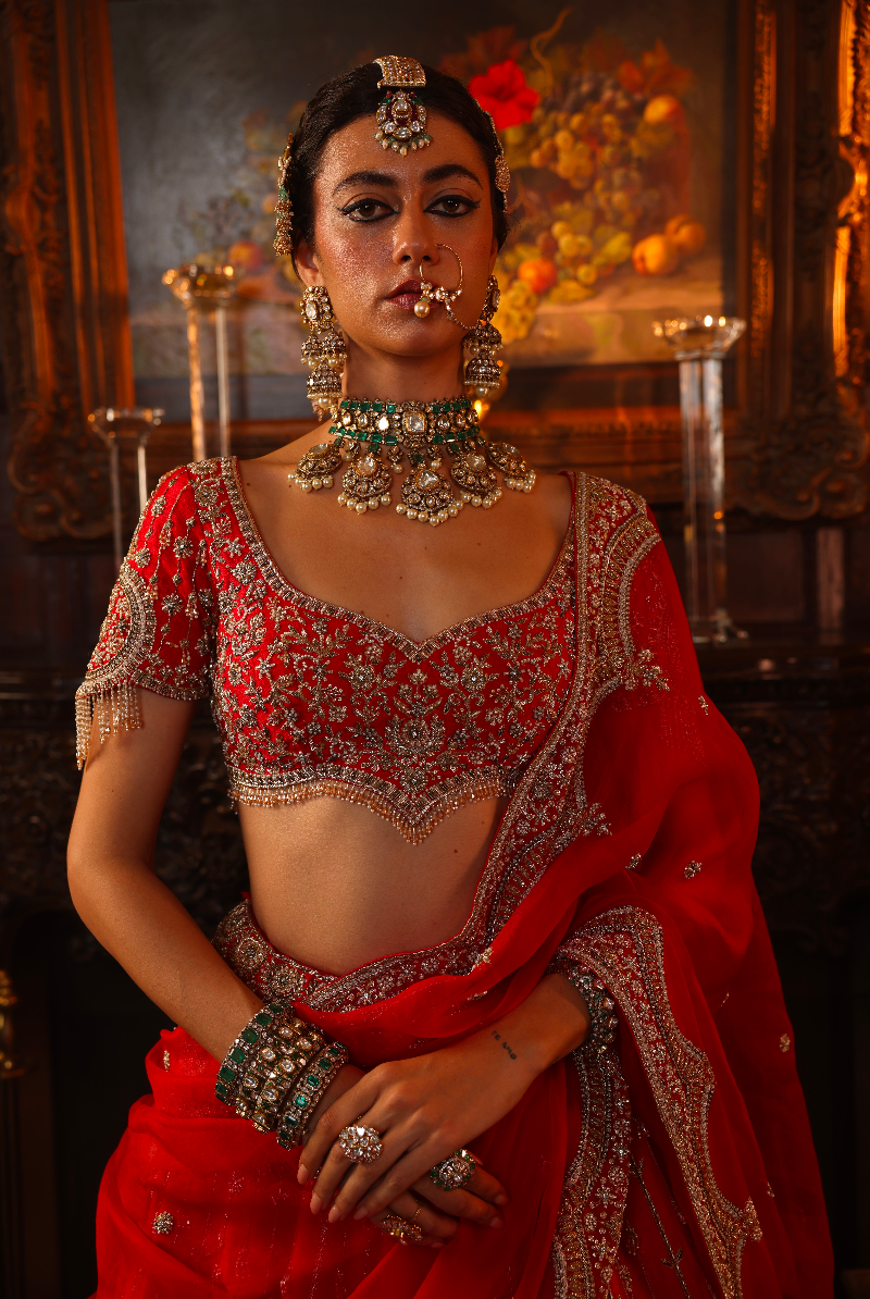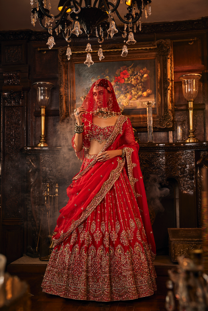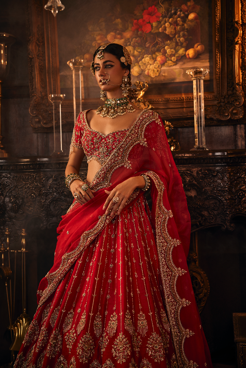 NAZAKAT, Red Pure raw silk lehenga set hand embroidered in traditional motifs.