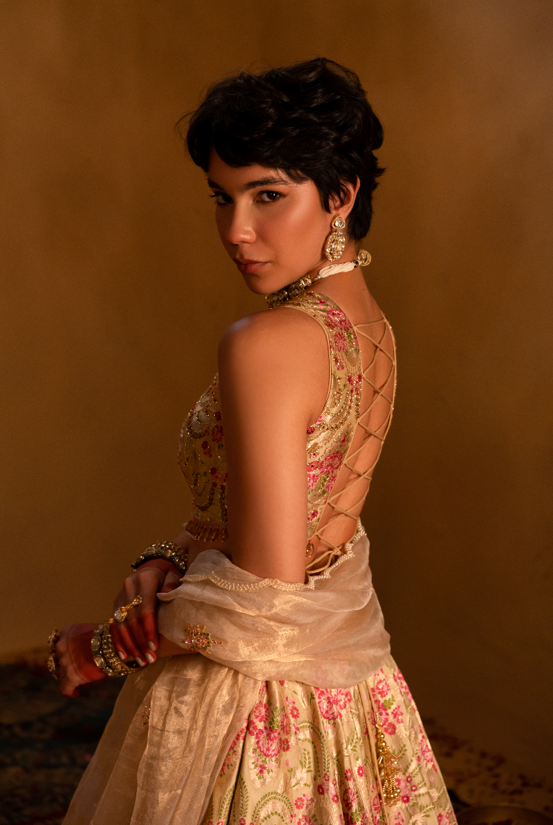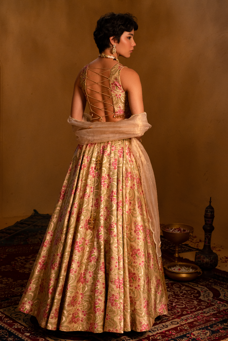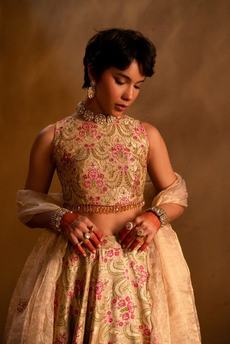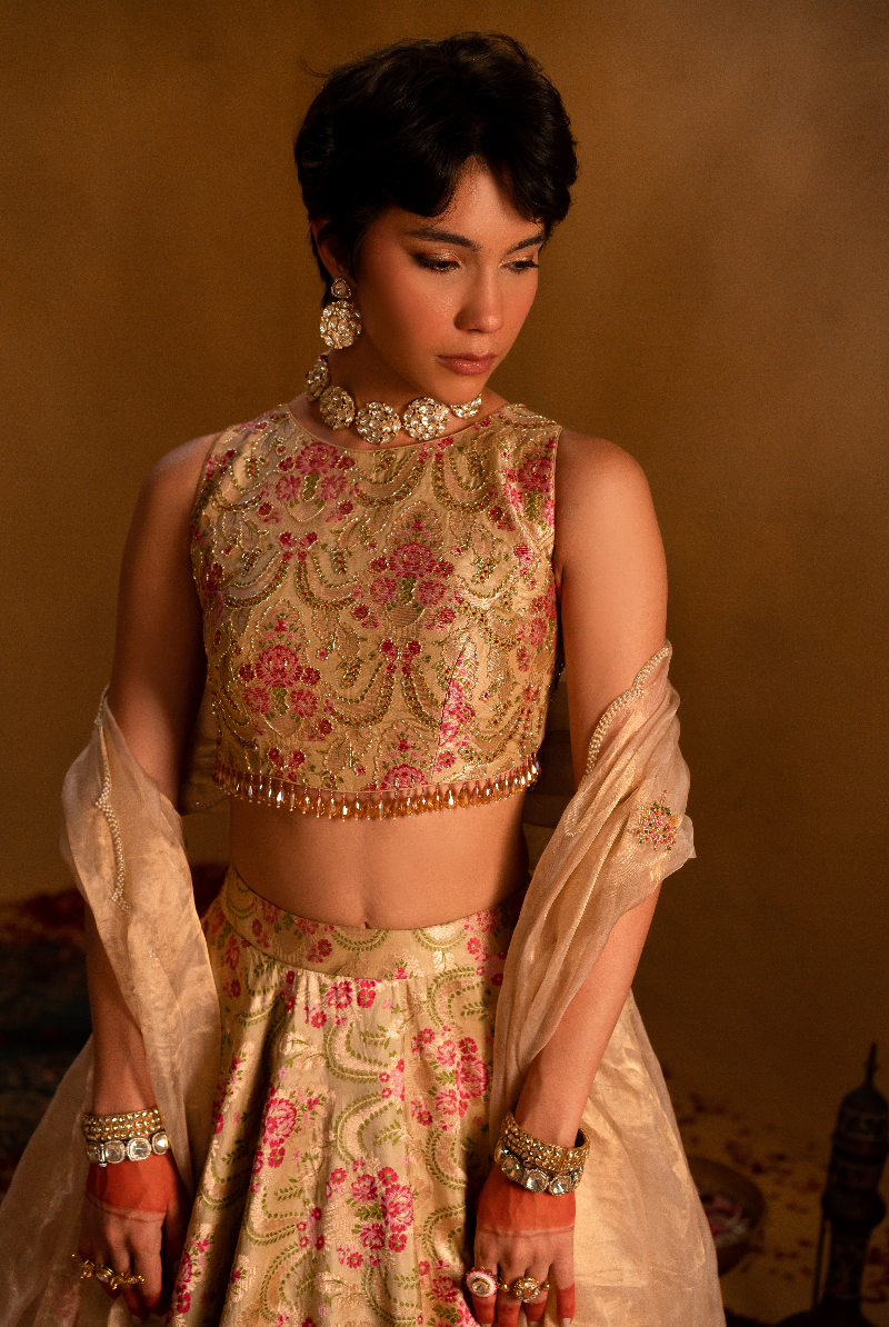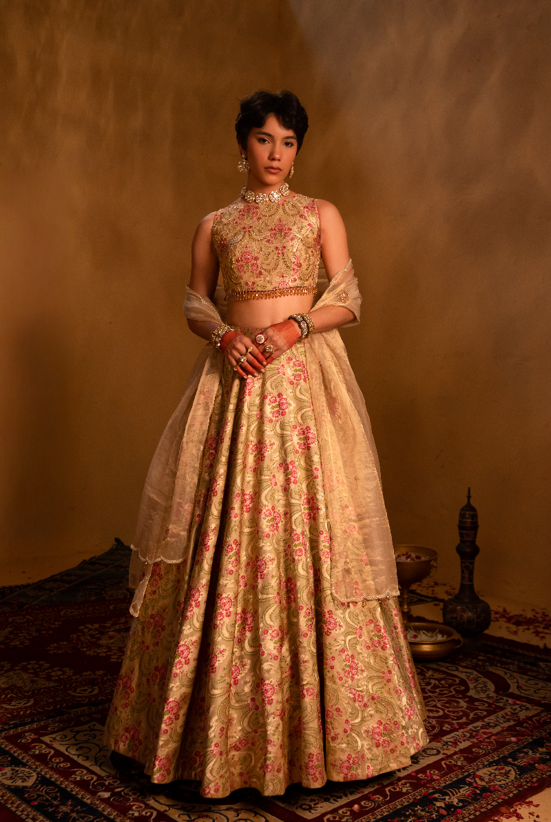 Salmon Peach Pure Kinkhab Lehenga Set with Hand Embellished Blouse and Dupatta.