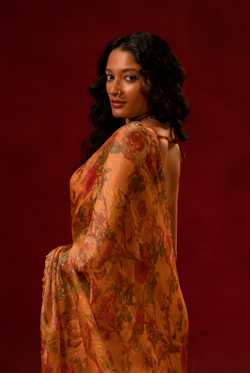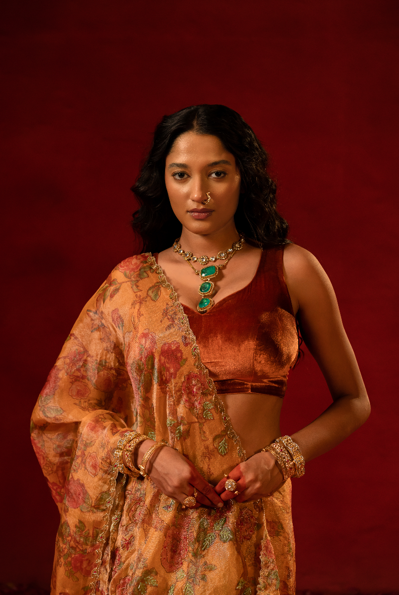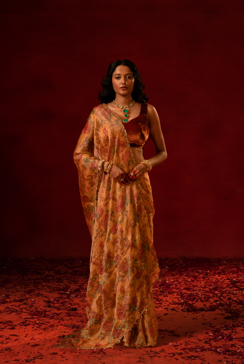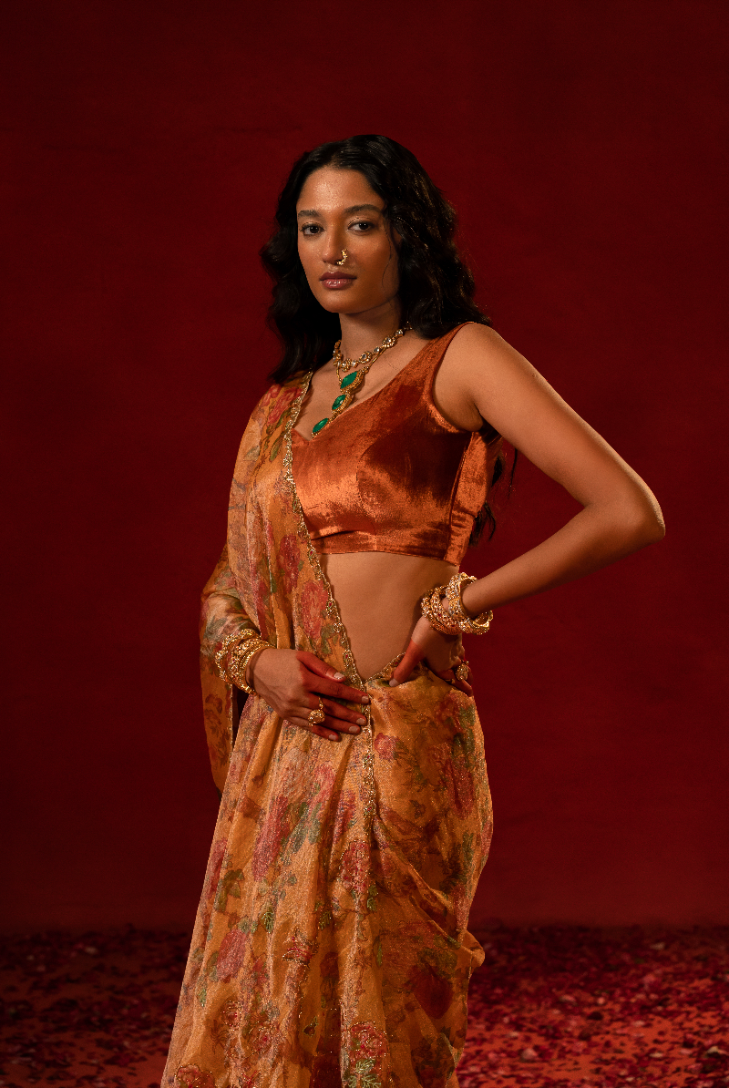 Amber gold Floral Tissue Saree with Burnt Orange Velvet blouse.